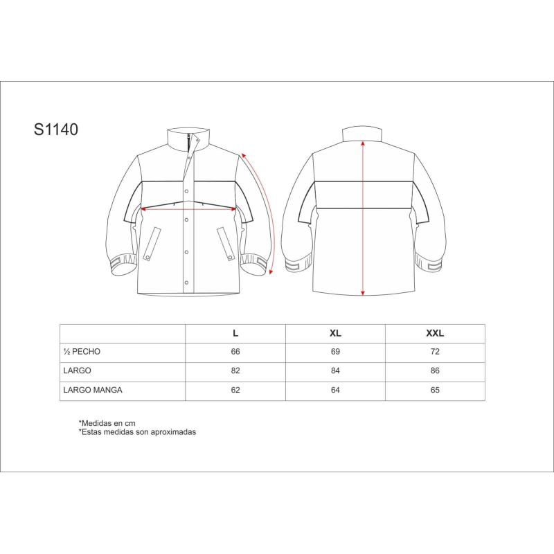 Parka con forro polar interior desmontable mediante cremalleras y corchetes. Exterior: Parka combinada tricolor de cuello alto revestido en polar. Cierre de cremallera de doble tirador oculta por solapa postiza con corchetes. Dos bolsos de pecho interiores con cierre de cremallera. Dos bolsos laterales con cierre de cremallera y solapa de corchete. Un bolso de pecho de plastón con cierre de velcro en el interior. Puño con elástico y ajuste de velcro. Faldón ajustable en el interior de la cintura con cierre de corchetes. Vivos reflectantes. Interior: Chaqueta polar de cuello alto y cierre de cremallera. Dos bolsos laterales con cierre de cremallera. Bocamanga con elástico. Cordón elástico con pieza ajustable en el bajo. Vivos reflectantes. 100% Poliéster