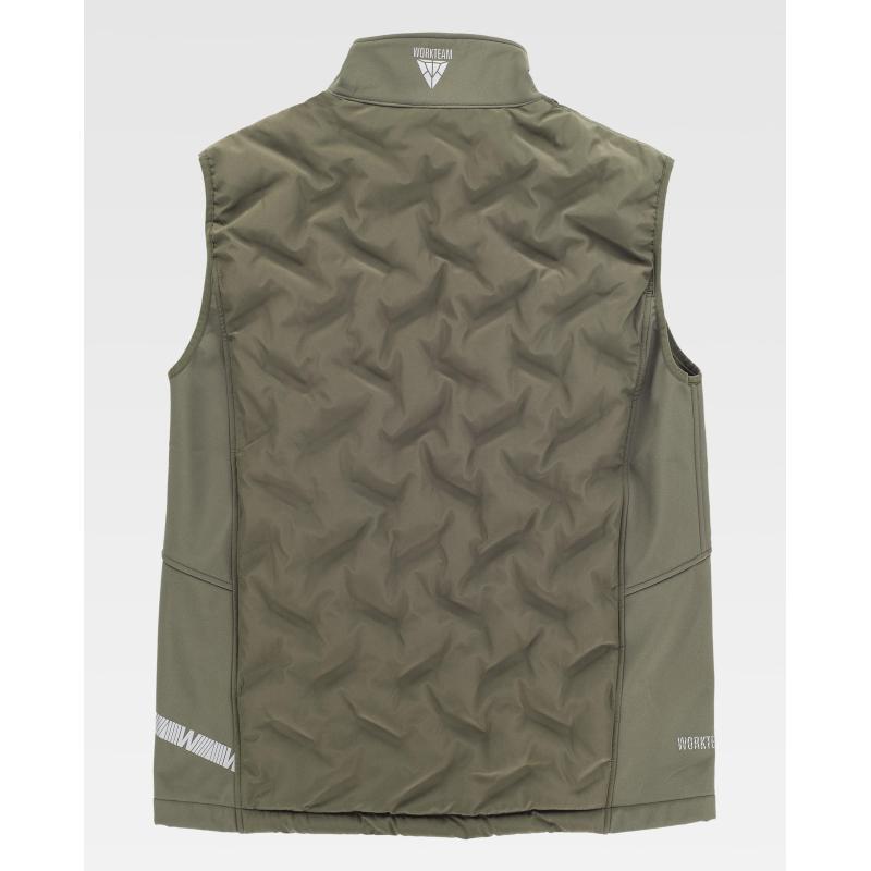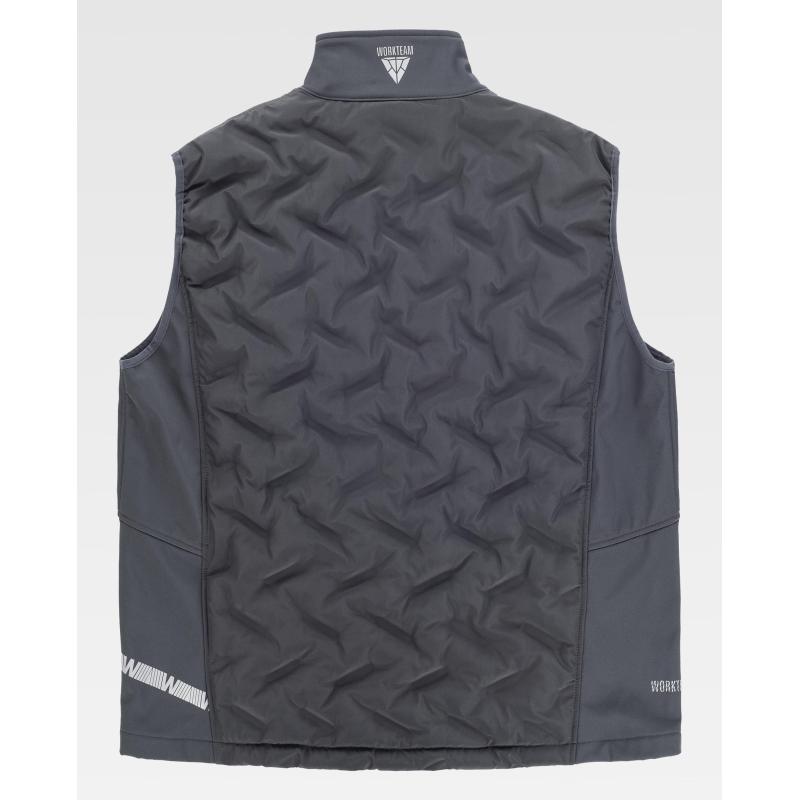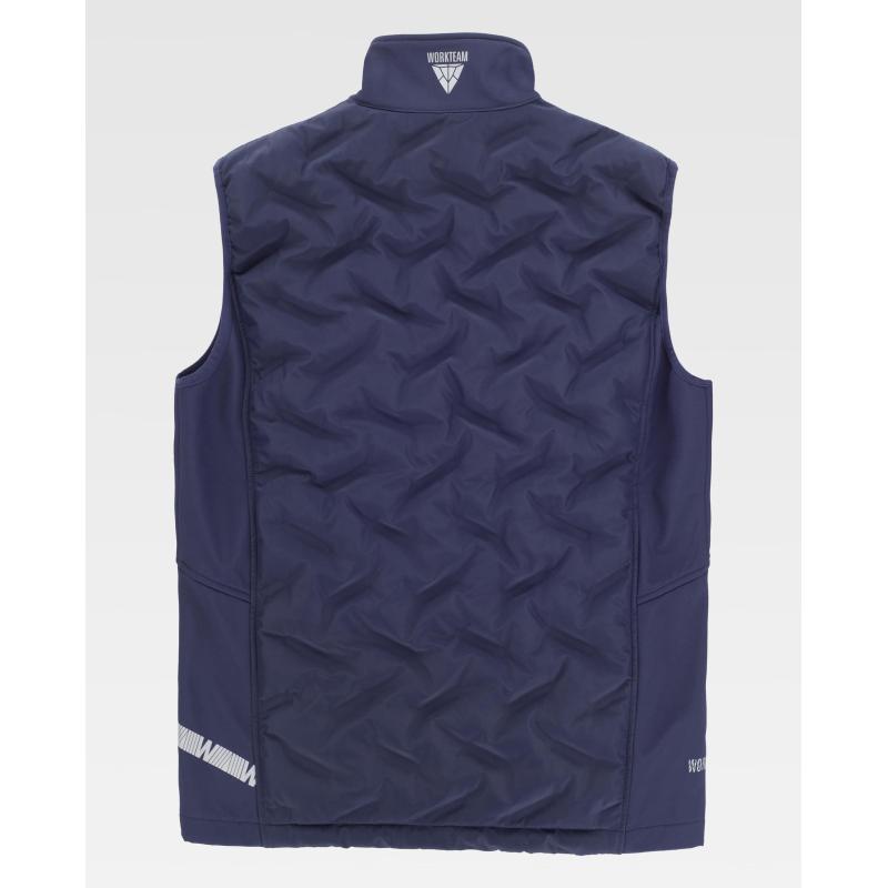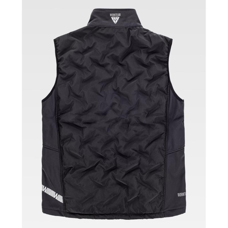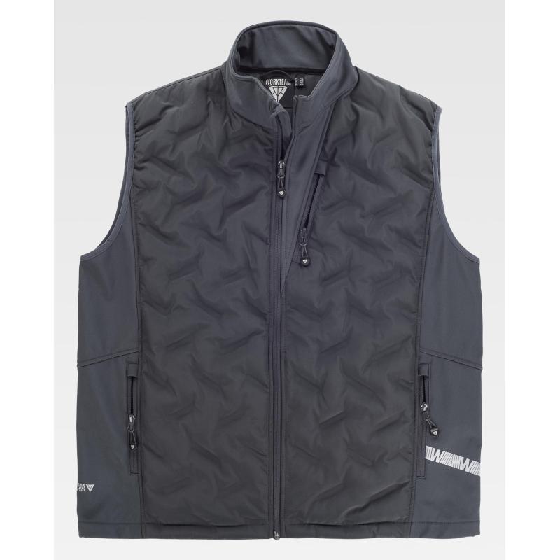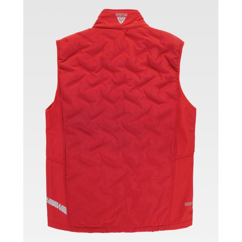 Chaleco Workshell combinado con tejido acolchado sellado y con detalles reflectantes. Cuello alto con cierre de cremallera de nylon. Solapa protectora interior vuelta en la parte superior cubriendo la cremallera. Un bolso de pecho y dos laterales interiores con cierre de cremallera. Cinta reflectante decorativa personalizada en un costado. Sisas ribeteadas con bies elástico. 100% Poliéster / 94% Poliéster 6% Elastano