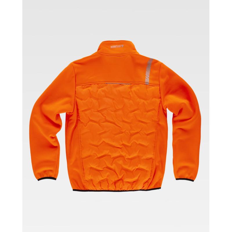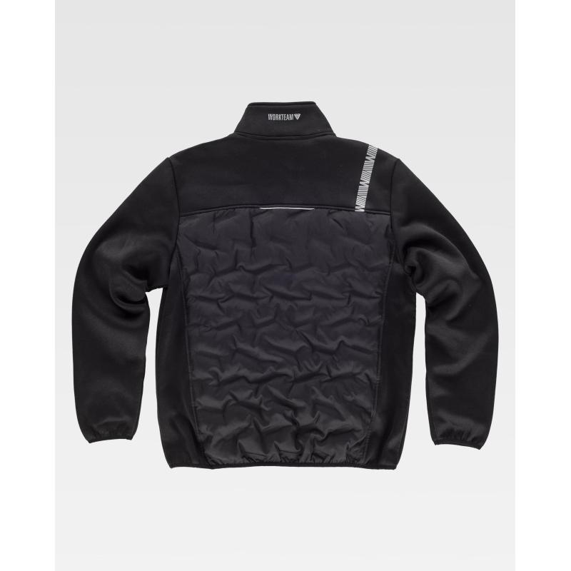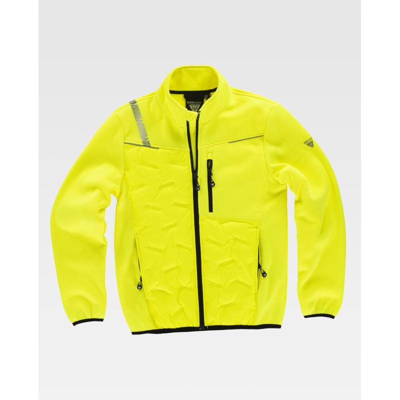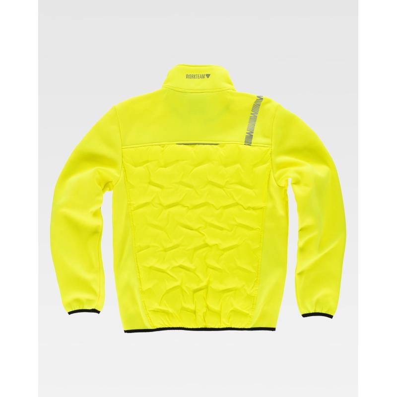 Chaqueta combinada con tejido acolchado sellado y con detalles reflectantes. Cuello alto con cierre de cremallera de nylon. Solapa protectora interior vuelta en la parte superior cubriendo la cremallera. Un bolso de pecho y dos laterales interiores con cierre de cremallera de nylon. Cinta reflectante decorativa personalizada en hombro. Puños y bajo ribeteados con bies elástico. 100% Poliéster