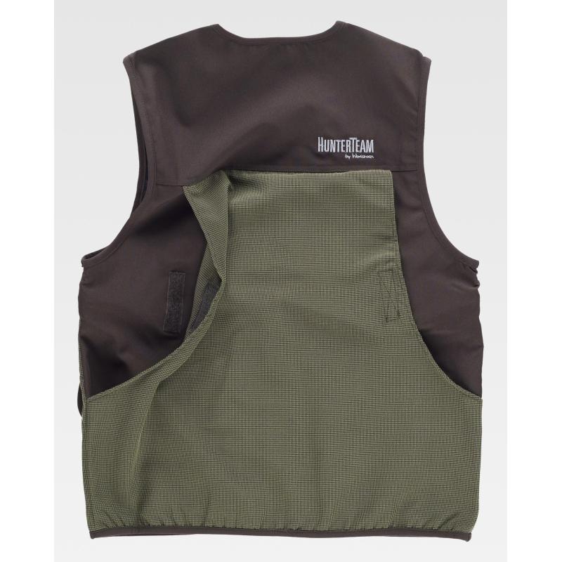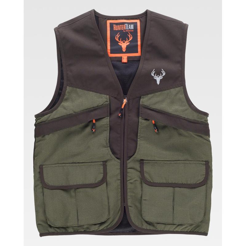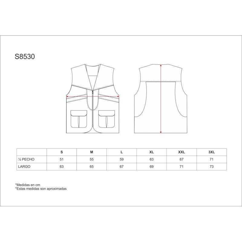 Chaleco impermeable tipo safari en tejido Oxford combinado con Ripstop anti espinos. Escote a pico, canesús y cierre de cremallera de nylon. Dos bolsos de pecho solapados con cierre de cremallera de nylon. Dos accesos interiores de gran capacidad en los costados. Dos bolsos laterales con fuelle y cartera de velcro. Un bolso de gran capacidad con doble acceso y cierre de velcro en la espalda. Ribeteado con bies. Tejido antidesgarros de alta resistencia. Forro interior de rejilla. 50% Poliéster 50% Rayón