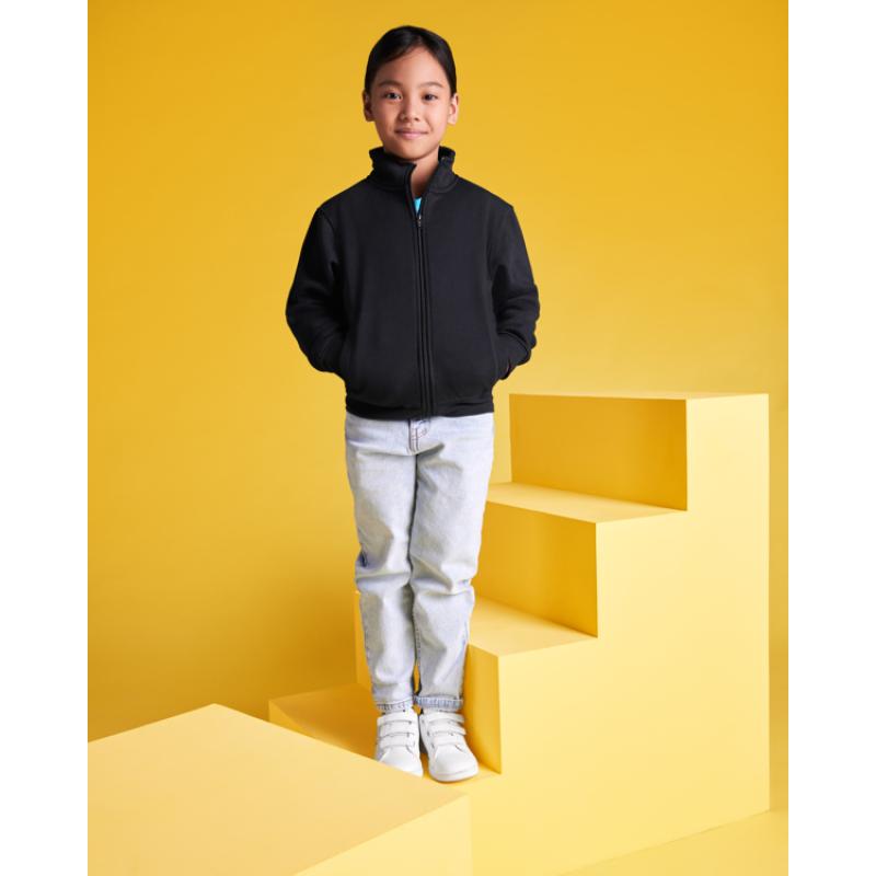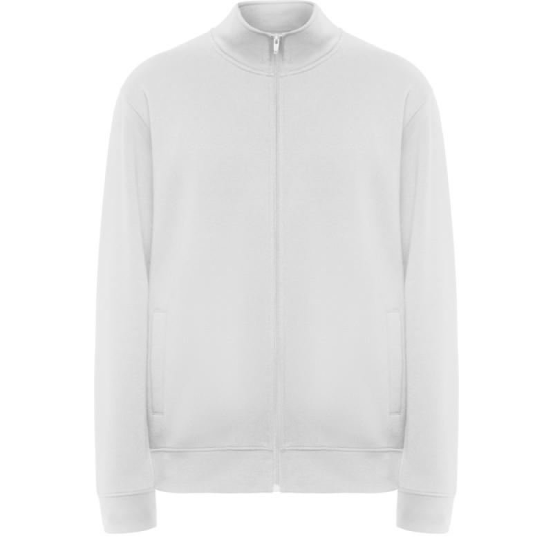 Sudadera unisex con cremallera frontal y cuello alto. Cremallera al tono. Dos bolsillos laterales con ribete del mismo tejido. Puños y cinturilla en canalé 2x1 con elastano. Cubrecosturas del mismo tejido.