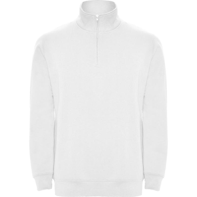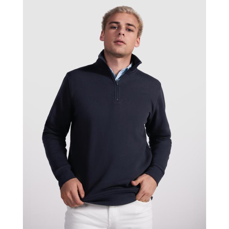 Sudadera unisex media cremallera y cuello alto. Cremallera al tono. Puños y cinturilla en canalé 2x1 con elastano. Cubrecosturas del mismo tejido.