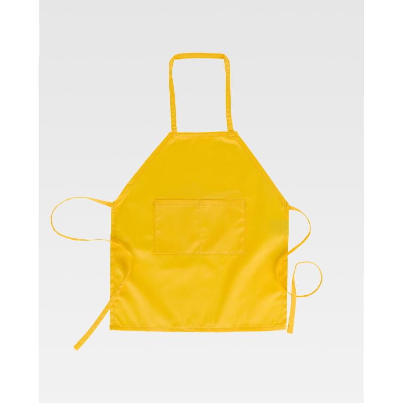 Delantal con peto infantil de color liso. Un bolso central compartimentado. Cinta de cuello fija. Tiras para ajustar en la cintura. 65% Poliéster 35% Algodón
