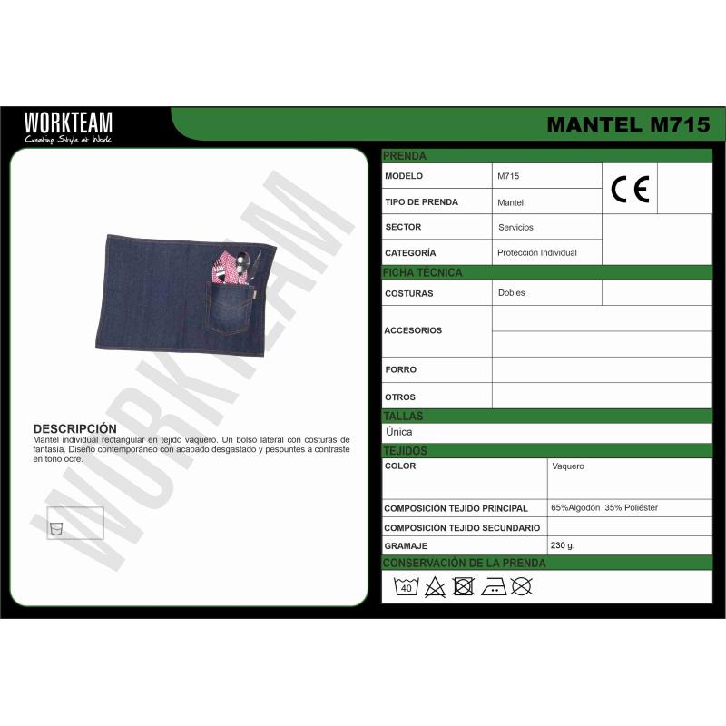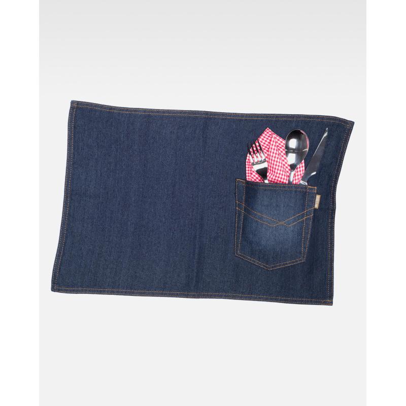Mantel individual rectangular en tejido vaquero. Un bolso lateral con costuras de fantasía. Diseño contemporáneo con acabado desgastado y pespuntes a contraste en tono ocre. 65% Algodón 35% Poliéster