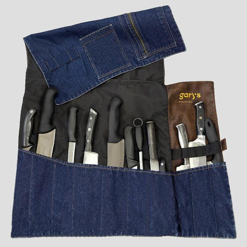 * 4 bolsillos individuales para cuchillos o utensilios profesionales * Herrajes metálicos en plata vieja, resistentes y con estilo vintage * Cierre mediante correa, seguro y ajustable * Materiales: tejano azul 100% algodón + polipiel arena, resistentes y duraderos * Diseño elegante, práctico y fácil de transportar