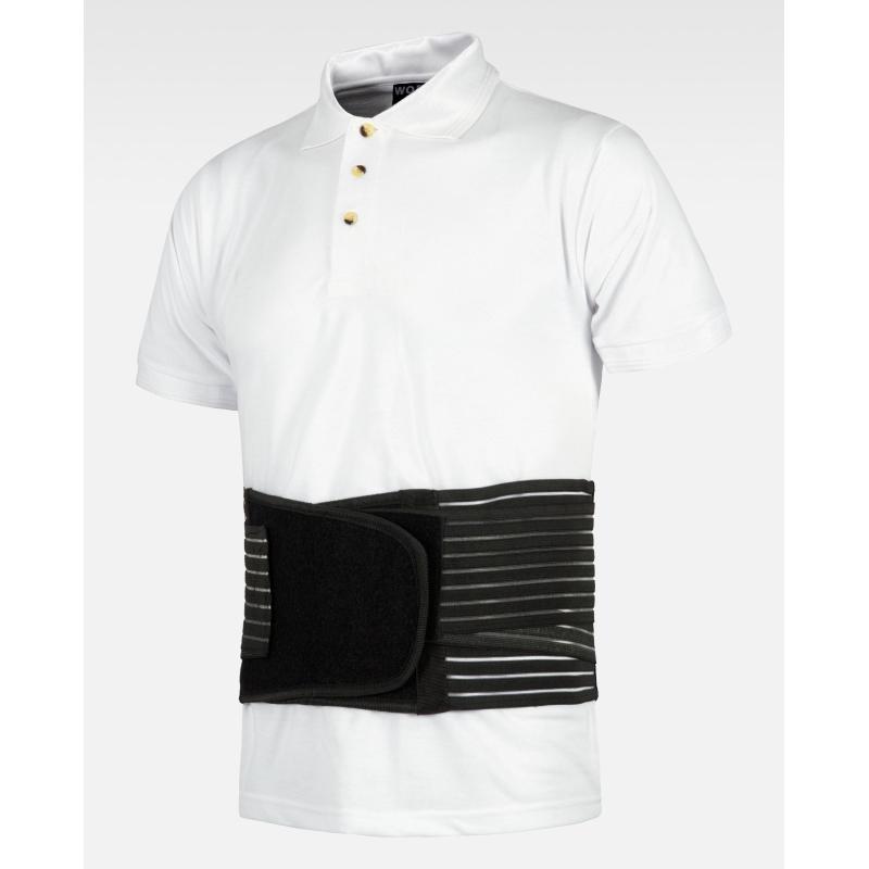 Faja lumbar elástica reforzada por ballenas, ajustable con doble velcro. 60% Poliéster / 20% Nylon / 20% Látex