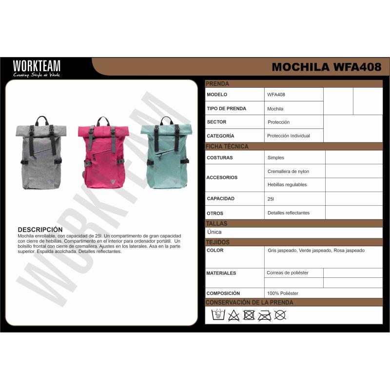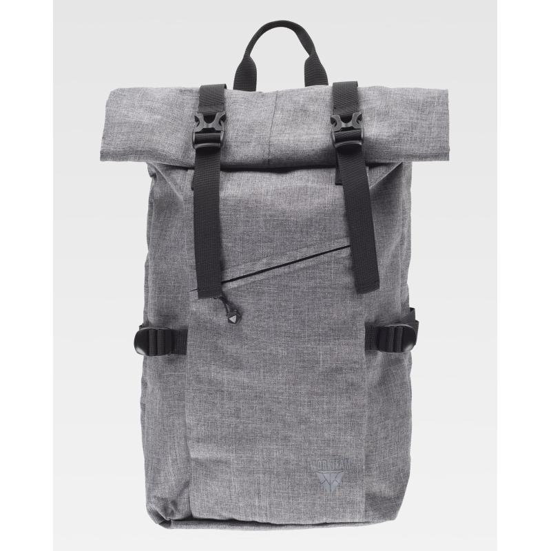 Mochila enrollable, con capacidad de 25l. Un compartimento de gran capacidad con cierre de hebillas. Compartimento en el interior para ordenador portátil.  Un bolsillo frontal con cierre de cremallera. Ajustes en los laterales. Asa en la parte superior. Espalda acolchada. Detalles reflectantes.  100% Poliéster
