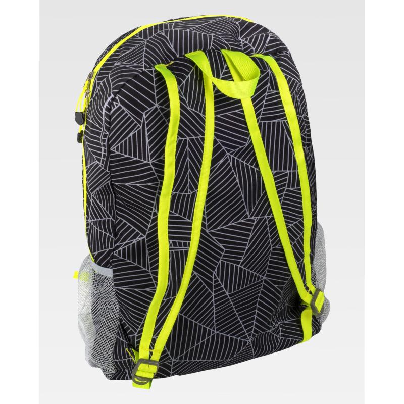 Mochila estampada enrollable con capacidad de 21l. Un compartimento de gran capacidad con una subdivisión interior. Un gran compartimento central con cierre de hebilla. Un bolsillo frontal con cierre de cremallera. Dos compartimentos laterales de rejilla. Asa en la parte superior. Bolsa de transporte con pieza ajustable. 100% Poliéster
