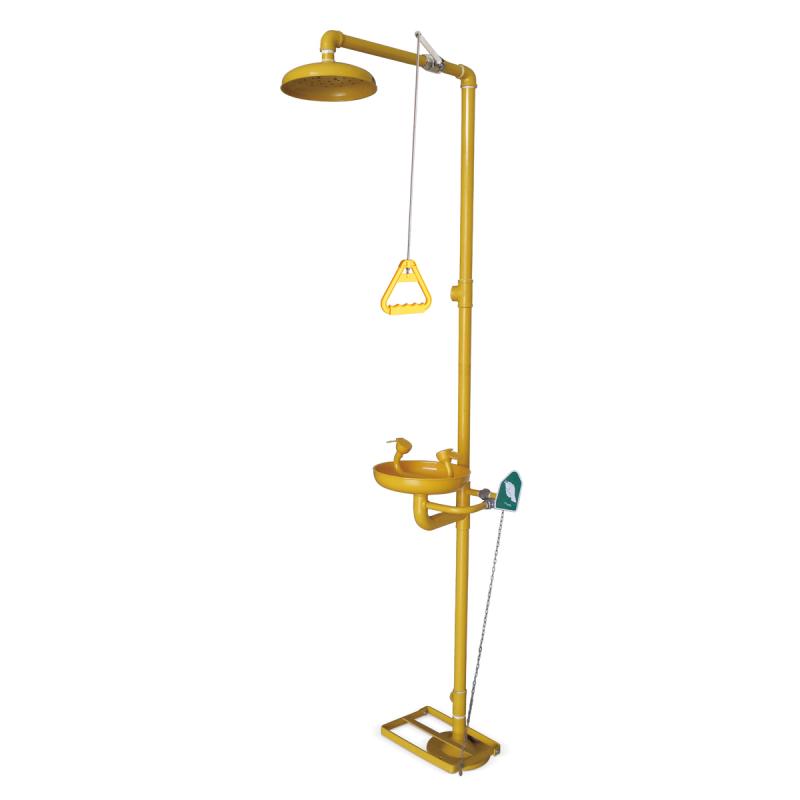 Características: Ducha-lavaojos con estructura de acero galvanizado, para ser usada en casos de salpicaduras de elementos nocivos a los ojos o al cuerpo del trabajador, en el que el agua produzca un efecto de arrastre de la sustancia nociva.