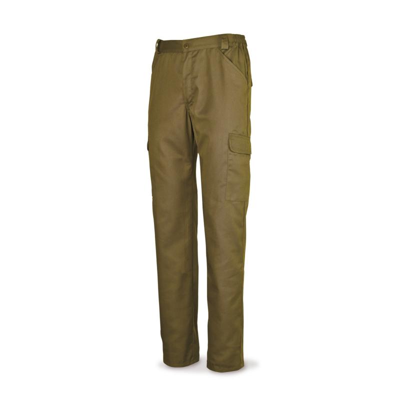 Pantalón fabricado con tejido de 200 gr/m2. Seis bolsillos: dos en pernera tipo cargo de plastrón, dos en cadera tipo diagonal y dos traseros de plastrón con cierre por tapeta. Trabillas extra anchas en cintura.