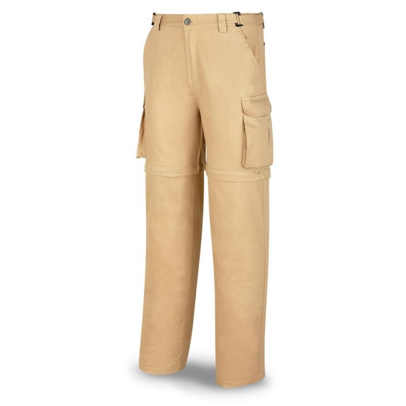 Pantalón fabricado con tejido 100% algodón de 200 gr/m2. Seis bolsillos: dos tipo francés a la cintura, dos tipo cargo en perneras de fuelle y dos traseros. Cintura ajustable con hebilla incorporada en cinturilla.