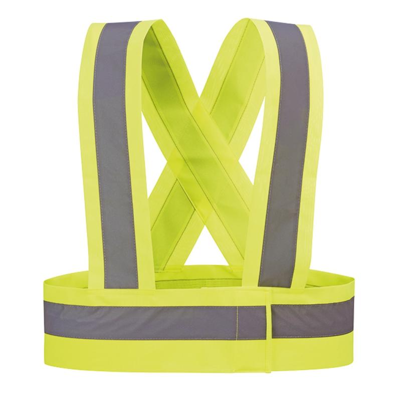 Tirantes de Alta Visibilidad de tejido de punto amarillo y bandas retrorreflectantes. Cierre frontal por velcro ubicado en cintura que permite ajustar el ancho de la prenda dentro del rango de su talla.
