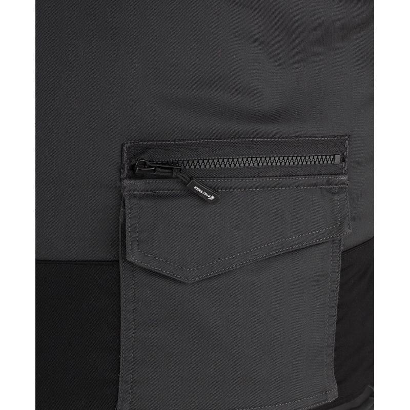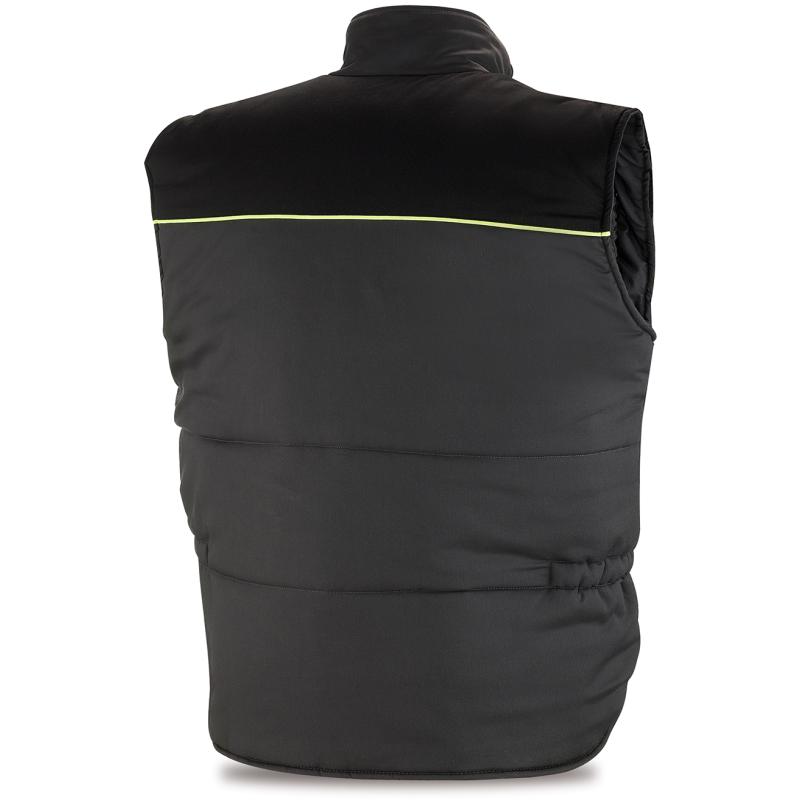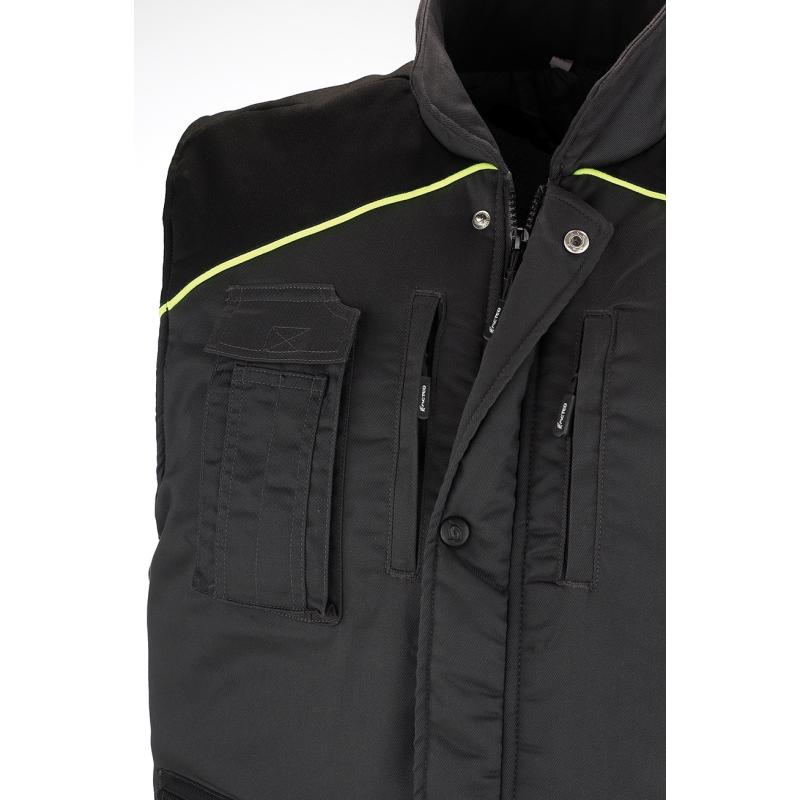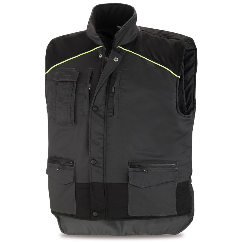 Chaleco stretch de color gris con contrastes en negro en zona inferior del panel frontal y hombros, con ribetes amarillo fluorescente. Faldón cubre riñones, ajuste a cadera mediante elástico en espalda. 5 bolsillos: 2 bolsillos de “triple uso” exteriores de plaque, 2 bolsillos exteriores de boca vertical ubicados a ambos lados del panel frontal con apertura y cierre por cremallera oculta por tapeta y 1 bolsillo de parche de “doble uso” en pecho.