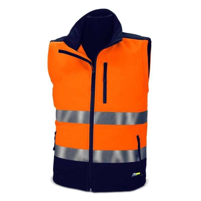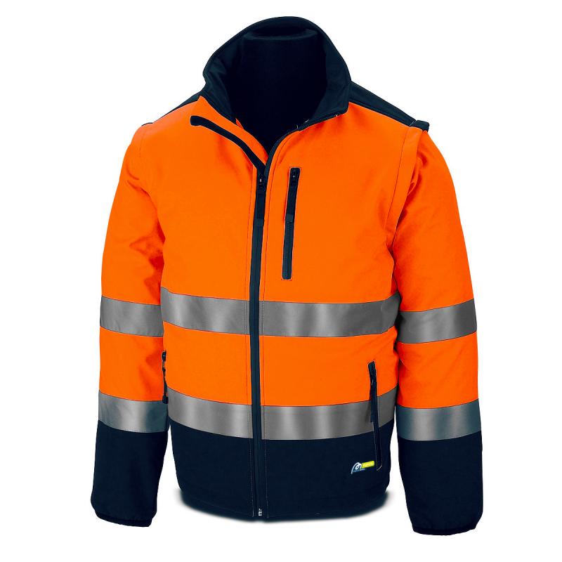 Cazadora Alta Visibilidad de tejido SoftShell naranja/azul marino. Mangas desmontables mediante cremallera para convertir en chaleco. Cierre de la prenda frontal vertical mediante cremallera de poliéster de espiral invisible “Waterproof”, con tope superior en borde del cuello alto con pieza de tejido y tepe inferior de la cremallera al bajo de la prenda. Cremallera en contorno de hombro y axila para el desmontado de las mangas. 2 bolsillos exteriores ubicados en el inferior de ambos delanteros, 1 bolsillo exterior en pecho y 2 bolsillos interiores .