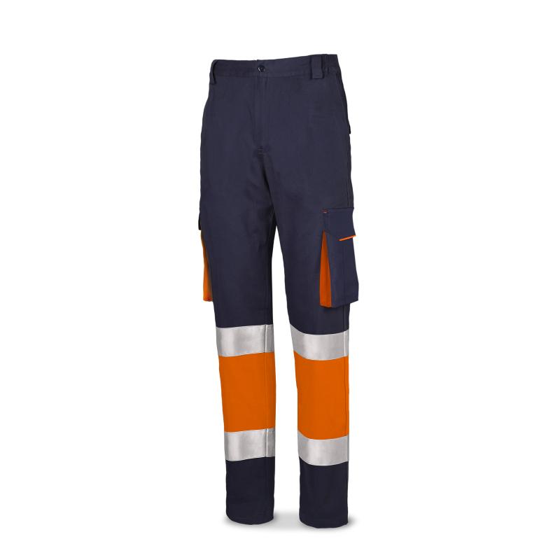 Pantalón Stretch naranja/azul marino de alta visibilidad. Ajuste a cadera con elástico trasero laterales y 5 trabillas. 6 bolsillos: 2 a la cadera tipo francés, 2 en perneras tipo cargo con contraste de tejido fluo en fuelle y 2 bolsillos traseros de plastrón con cierre por tapeta.Composición: 63% poliéster, 34% algodón y 3% elastano. Máx.X25.Masa Laminar: 240 gr/m2.