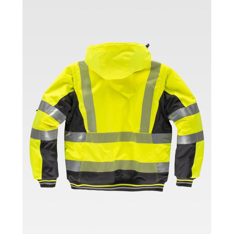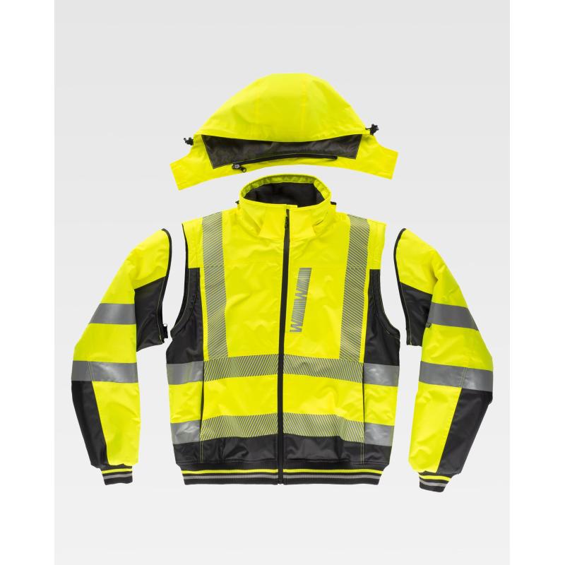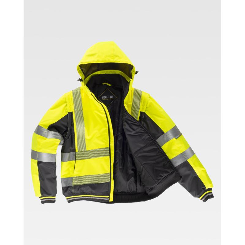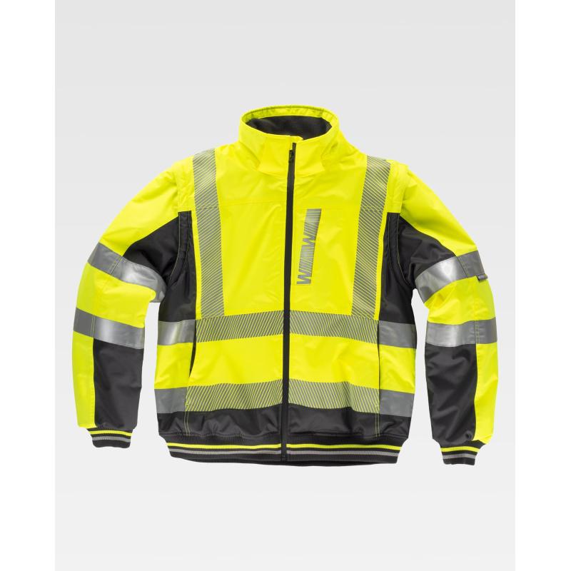 Piloto acolchada e impermeable en tejido Oxford, con mangas desmontables por medio de cremalleras impermeables. Combinada con alta visibilidad y con cintas reflectantes. Cuello alto forrado con polar y capucha desmontable con cremallera. Cierre de cremallera impermeable de nylon. Solapa protectora interior vuelta en la parte superior cubriendo la cremallera. Un bolso de pecho y dos laterales interiores con cremalleras impermeables de nylon. Un bolso en el interior con cierre de velcro. Dos cintas reflectantes segmentadas termoadhesivas en hombros, pecho y espalda. Dos cintas cosidas en las mangas y los costados. Cinta decorativa personalizada en pecho. Puños y bajo elásticos en punto de canalé. 100% Poliéster
