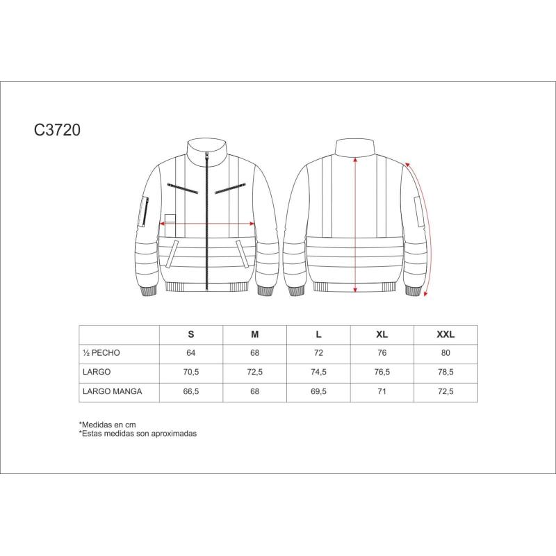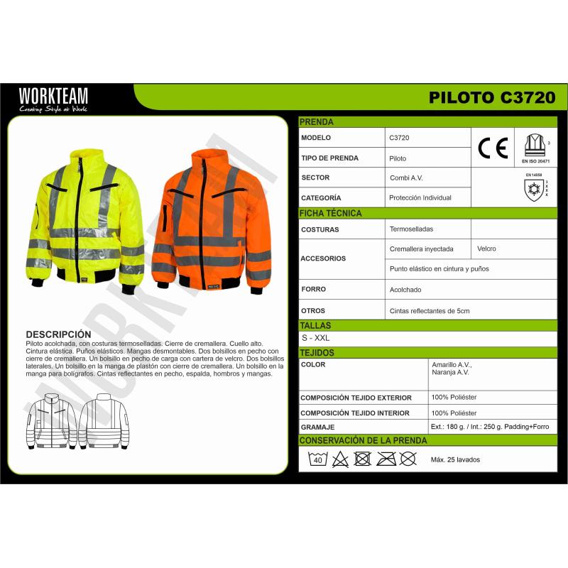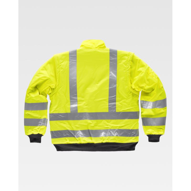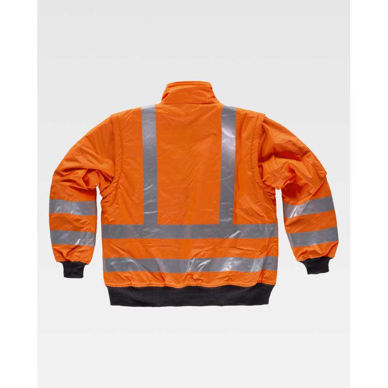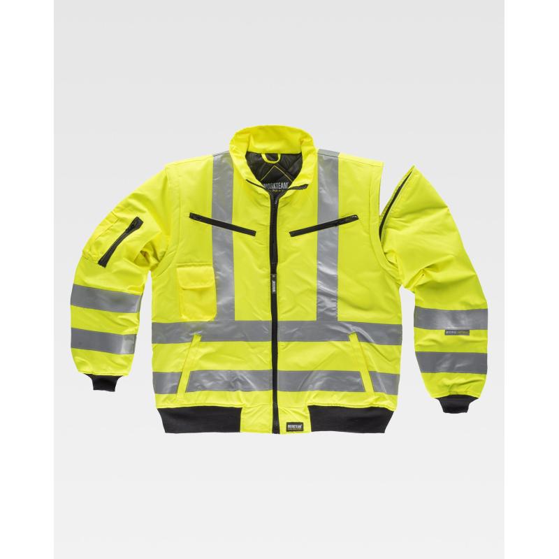 Piloto acolchada e impermeable en tejido Oxford, de alta visibilidad, con mangas desmontables y cintas reflectantes. Cuello alto y cierre de cremallera, sin capucha. Dos bolsos interiores con cierre de cremallera y un bolso auxiliar de fuelle con cartera de velcro en el pecho. Dos bolsos laterales de ojal. Un bolso de plastón con cierre de cremallera y bolsillo compartimentado en la manga. Un bolso de pecho de plastón en el interior. Una cinta reflectante en hombros y dos en pecho, espalda y mangas. Puños y cintura elásticos en punto canalé. 100% Poliéster