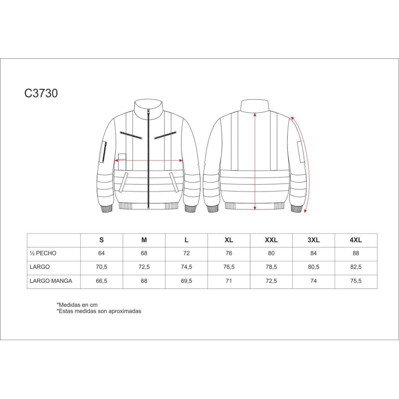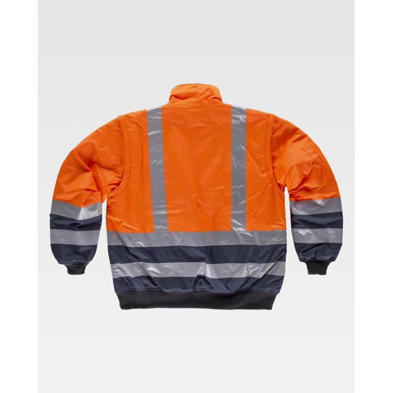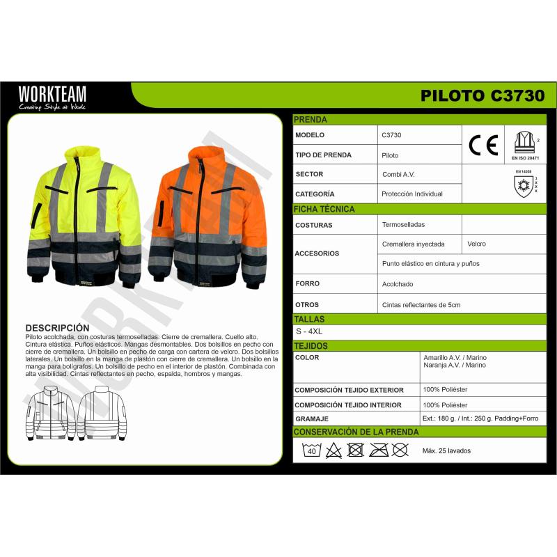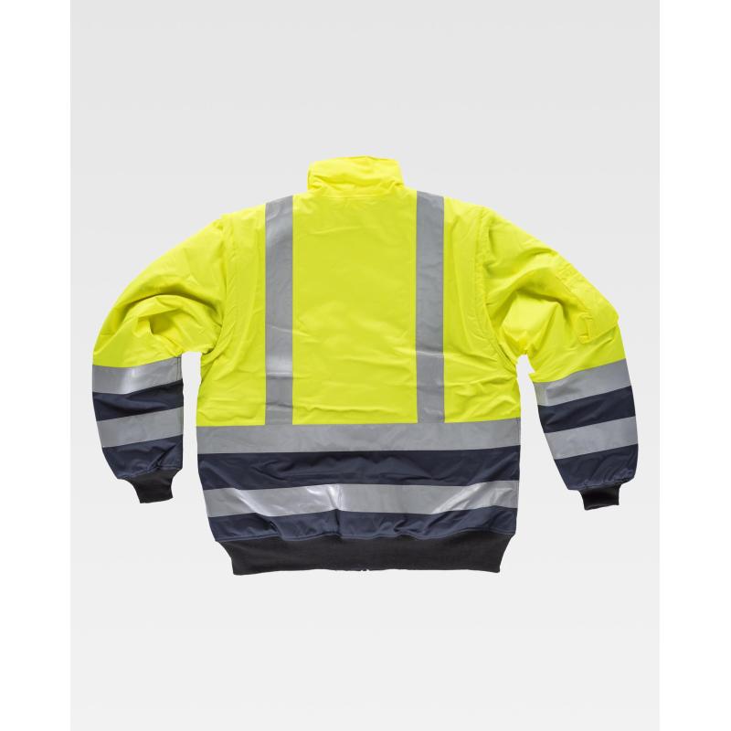 Piloto acolchada e impermeable en tejido Oxford, combinada, con mangas desmontables y cintas reflectantes. Parte superior de alta visibilidad. Cuello alto y cierre de cremallera. Dos bolsos interiores con cierre de cremallera y un bolso auxiliar de fuelle con cartera de velcro en el pecho. Dos bolsos laterales de ojal. Un bolso de plastón con cierre de cremallera y bolsillo compartimentado en la manga. Un bolso de pecho de plastón en el interior. Una cinta reflectante en hombros y dos en pecho, espalda y mangas. Puños y cintura elásticos en punto canalé. 100% Poliéster