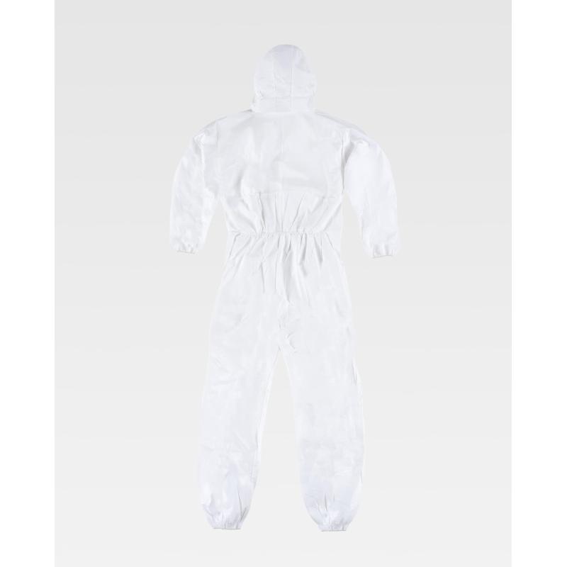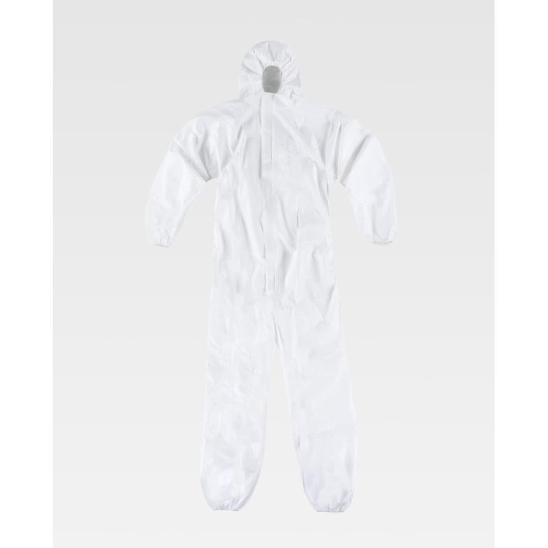 Buzo con capucha. Goma elástica en capucha, puños, cintura trasera y tobillos. Cremallera central oculta por solapa. Costuras remalladas reforzadas. Fabricado con una capa de film laminado microporoso no tejido. Protección contra líquidos y partículas. Antiestático, baja resistencia térmica con alta eficiencia de transmisión de vapor de agua y buena transpirabilidad. Está diseñado para ofrecer una barrera contra los agentes biológicos infecciosos y partículas radioactivas. Amplio rango de aplicación. Altamente funcional, cómodo y bajo nivel de pelusa. Film laminado microporoso de polipropileno