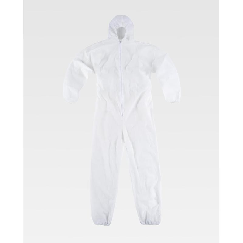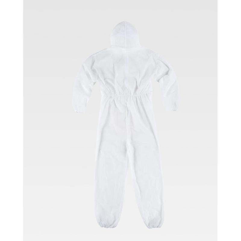 Buzo desechable con capucha. Goma elástica en puños y tobillos. Cremallera central. Fabricado con tejido no tejido de polipropileno. Ofrece una amplia gama de protección contra partículas secas no peligrosas, salpicaduras de agua limitadas y frente a la suciedad. Es ligero, transpirable y económico. Altamente funcional y cómodo. Polipropileno