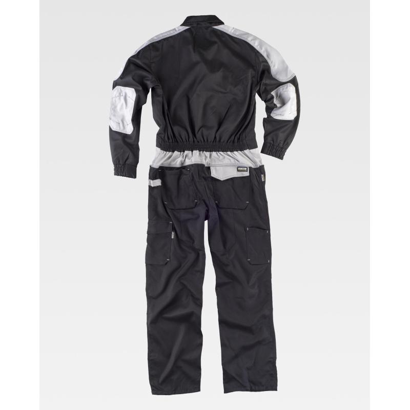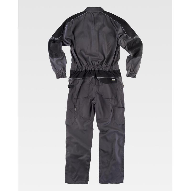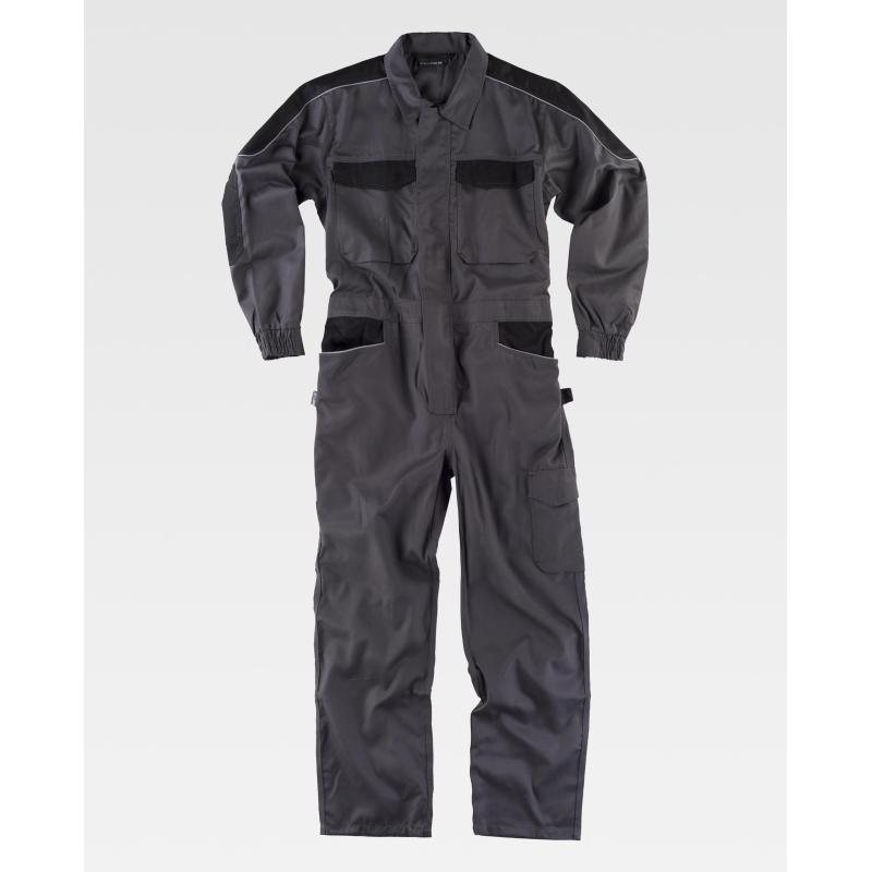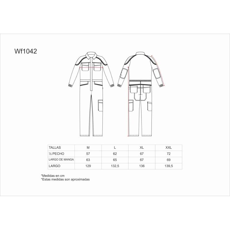 Buzo combinado, con refuerzos y triple costura. Cuello camisero y cierre de cremallera de nylon de doble tirador oculta por solapa postiza con velcro. Dos bolsos de pecho con cartera de velcro, dos bolsos de abertura inclinada y vivo en los costados, un bolso lateral de carga con cartera de velcro. Dos bolsos traseros con pliegue inferior, uno con cartera de velcro y un bolso de espátula. Trabilla porta martillo. Canesú delantero. Pieza combinada en hombros y mangas rematada con vivo reflectante. Coderas y refuerzo en culera. Presillas a contraste. Puño con elástico. Elástico en la espalda. Tratamiento del tejido para mayor estabilidad del color, resistente a lavados hasta 60º. 65% Poliéster 35% Viscosa