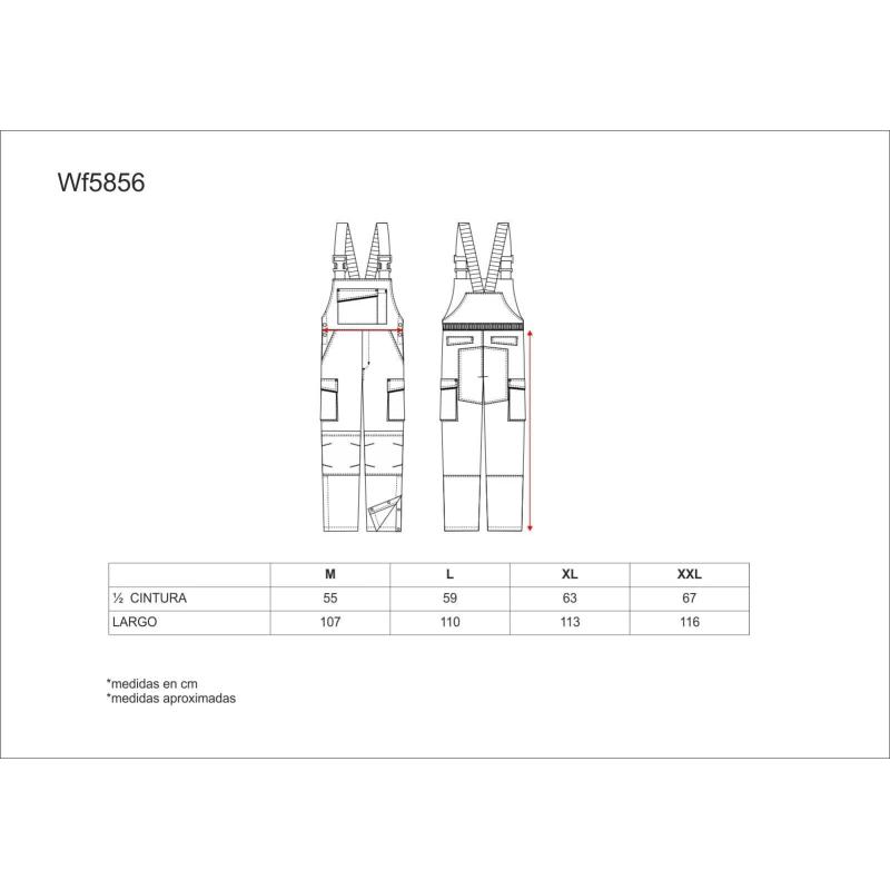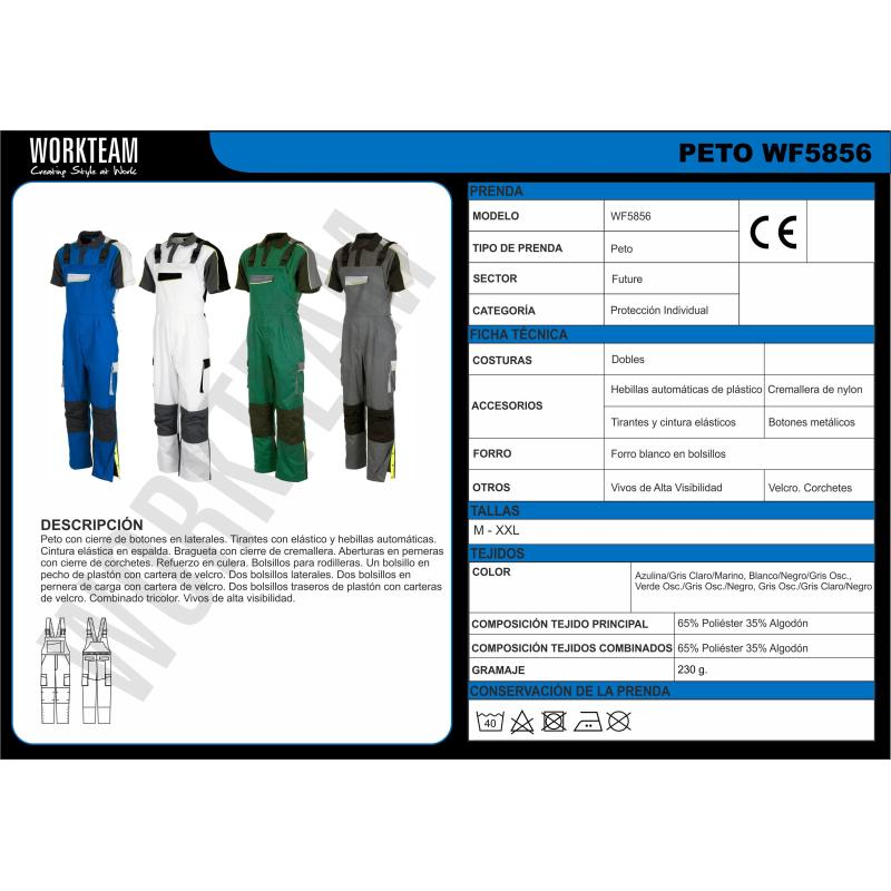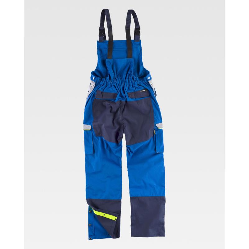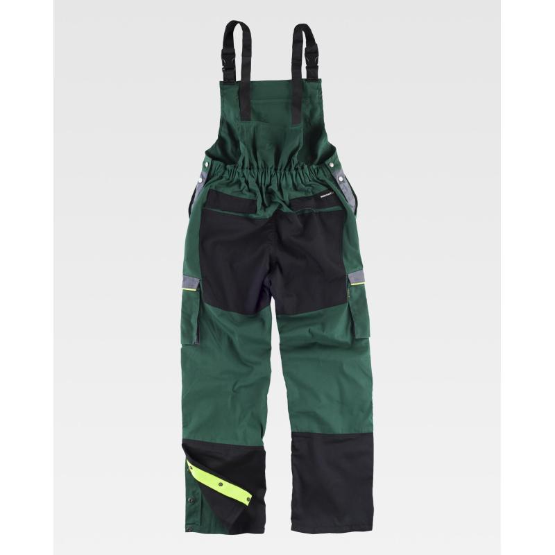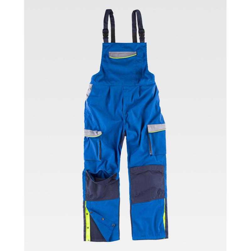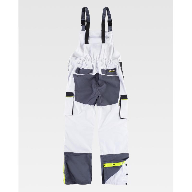 Peto tricolor con refuerzos y vivos de alta visibilidad. Media espalda cubierta, tirantes con elástico y hebillas automáticas. Un bolso de pecho de plastón con cartera de velcro, dos bolsos de abertura inclinada en los costados, dos bolsos laterales de carga con cartera de velcro. Dos bolsos traseros de plastón con cartera de velcro. Carteras rematadas con doble vivo. Refuerzo con cierre de cremallera para rodilleras de protección. Refuerzo en culera. Abertura en perneras con cierre de corchetes. Cierre de botones metálicos en los laterales y bragueta de cremallera de nylon. Elástico en la espalda. 65% Poliéster 35% Algodón