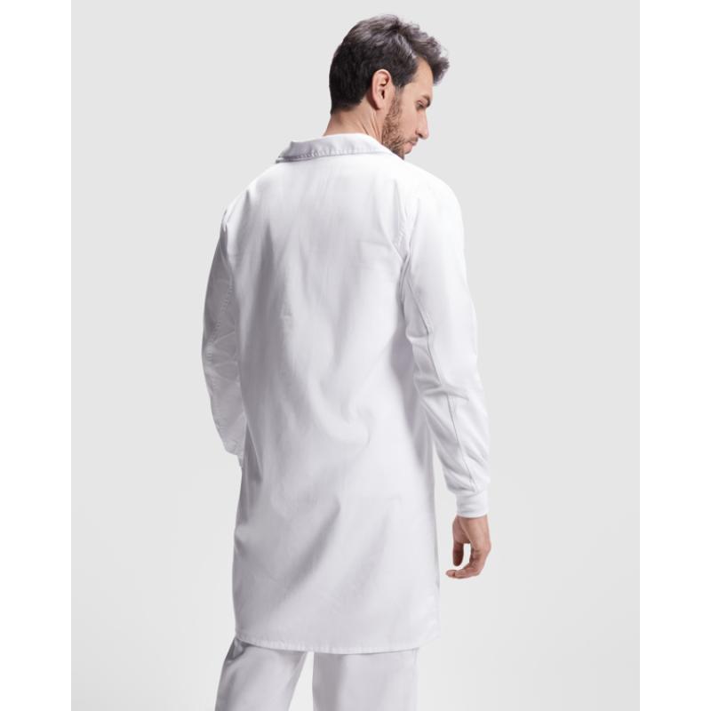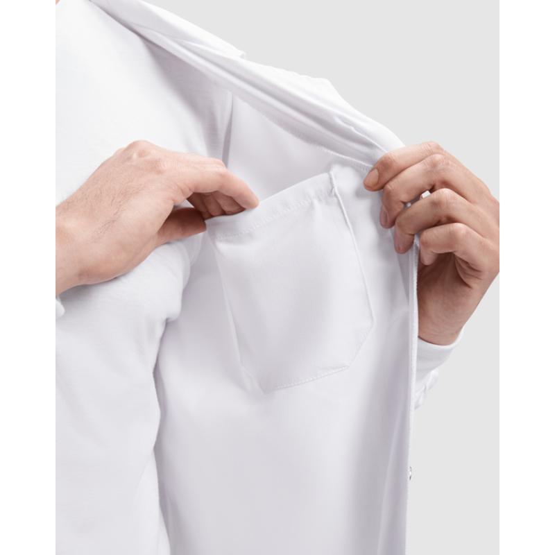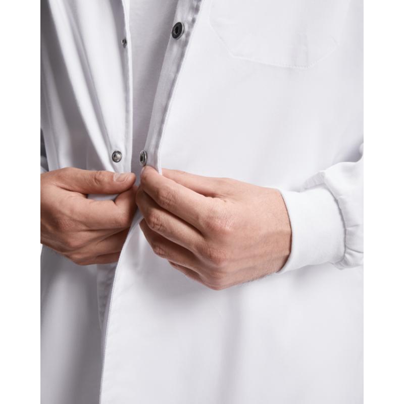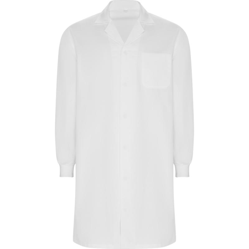 Bata unisex de laboratorio con solapa.· Apertura frontal con botones metálicos antioxidantes a presión ocultos en la tapeta delantera.· Bolsillo interno en pecho izquierdo.· Puños en rib 1x1.
