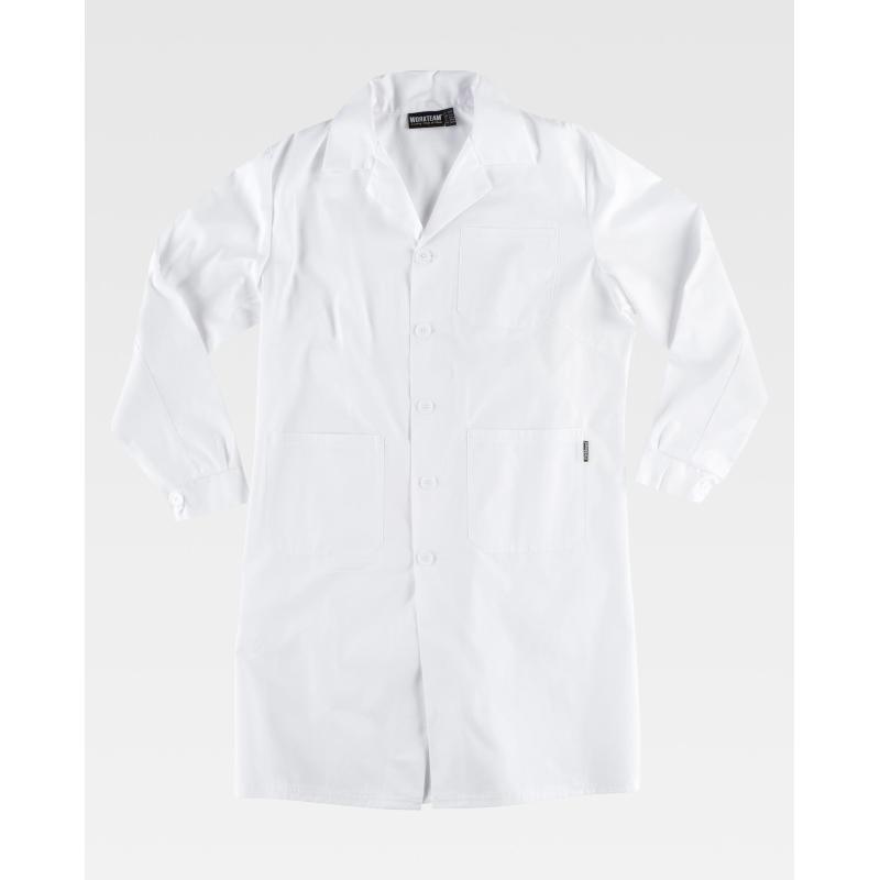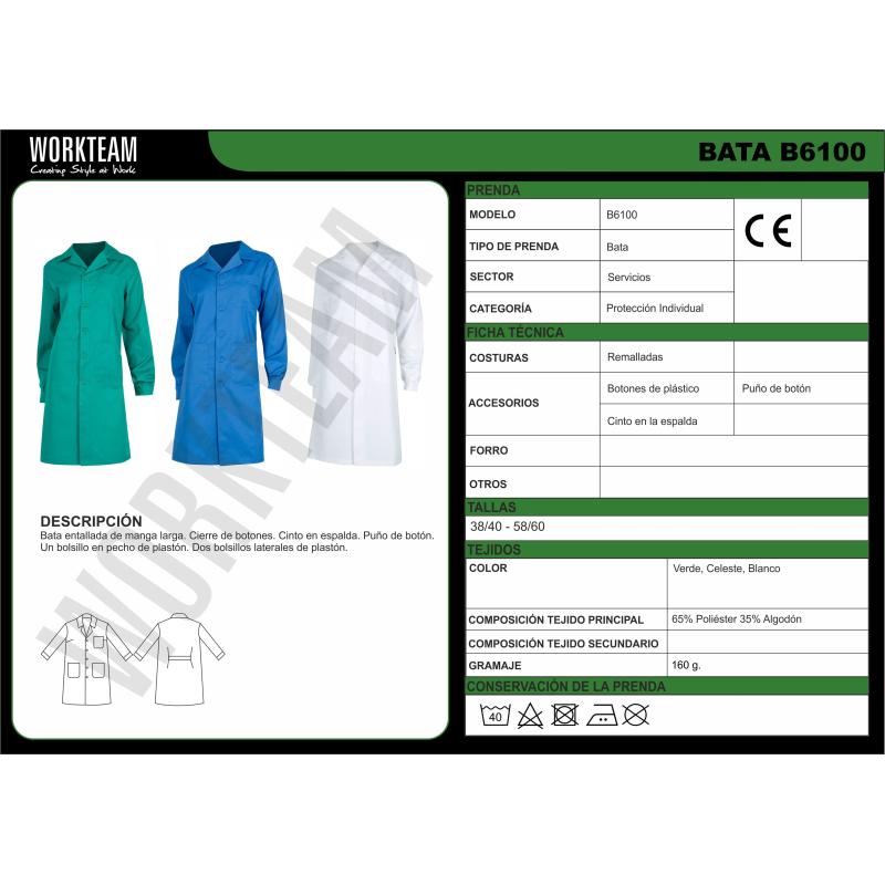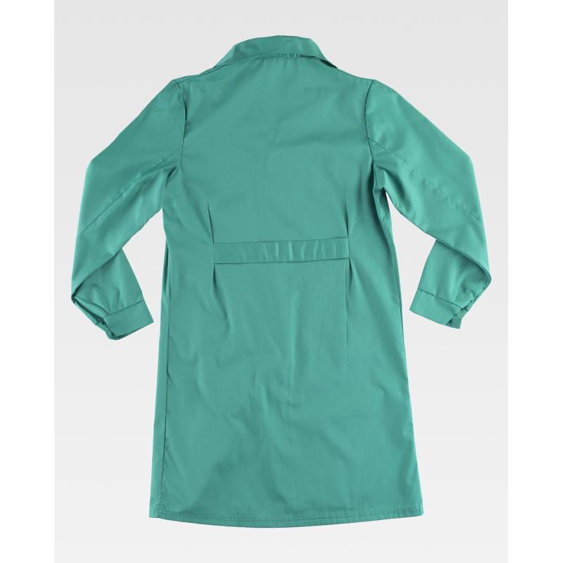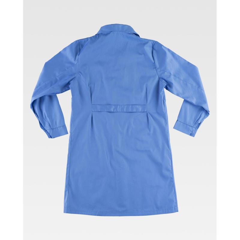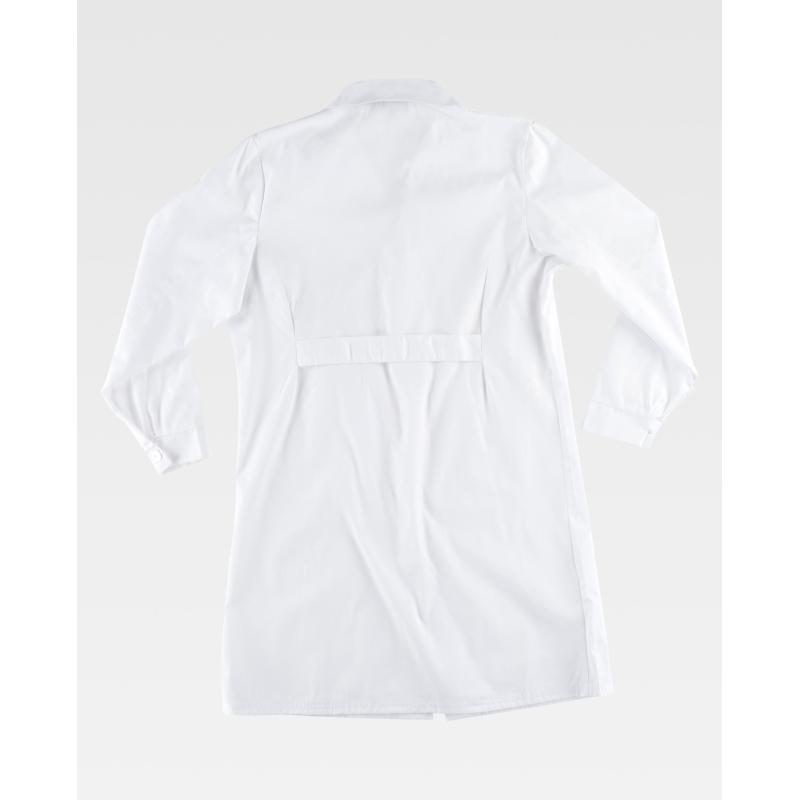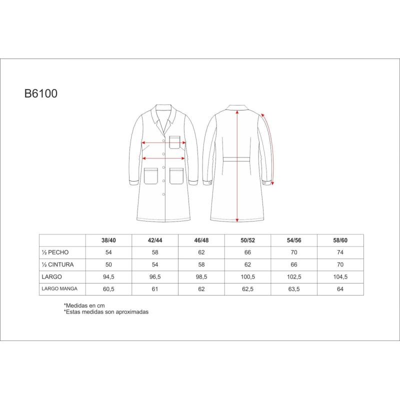 Bata entallada de señora con cuello solapa y cierre central de cinco botones al tono. Un bolso de pecho y dos bolsos laterales de plastón. Manga larga con puño de botón. Pinzas y cinto en la espalda. 65% Poliéster 35% Algodón