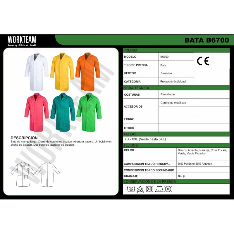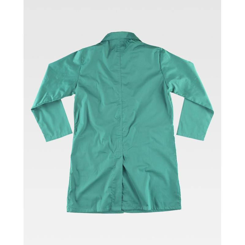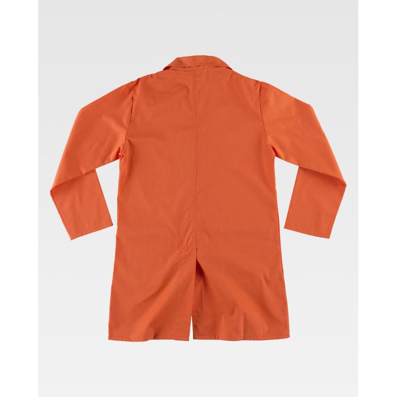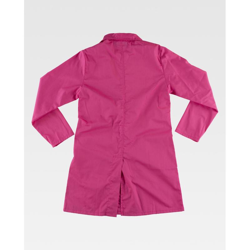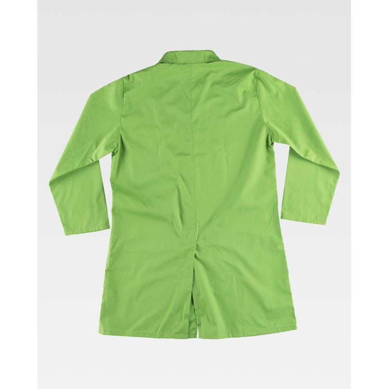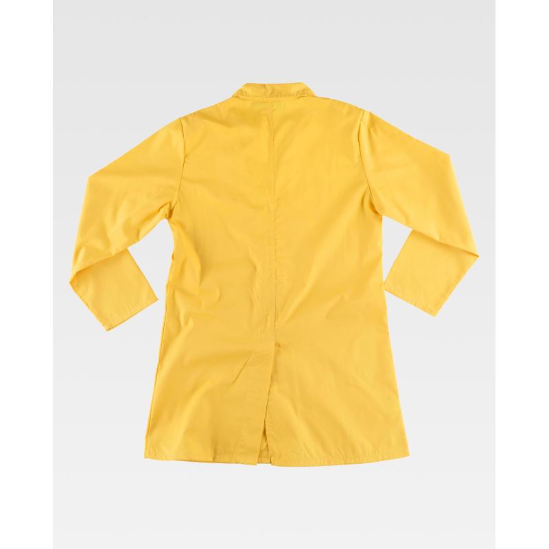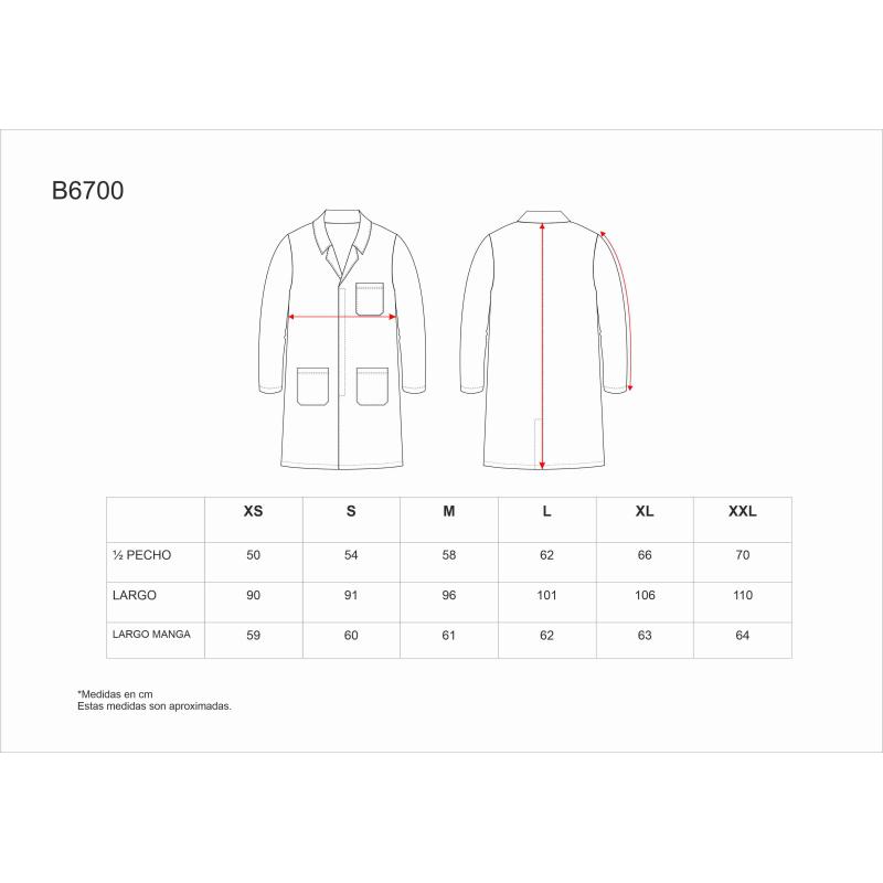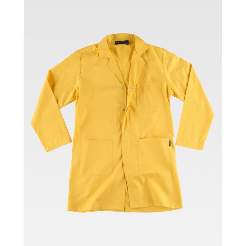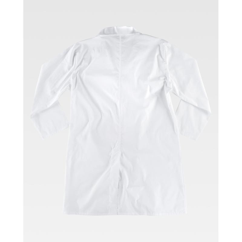 Bata unisex con cuello solapa y cierre central de corchetes ocultos. Un bolso de pecho y dos bolsos laterales de plastón, manga larga. 65% Poliéster 35% Algodón