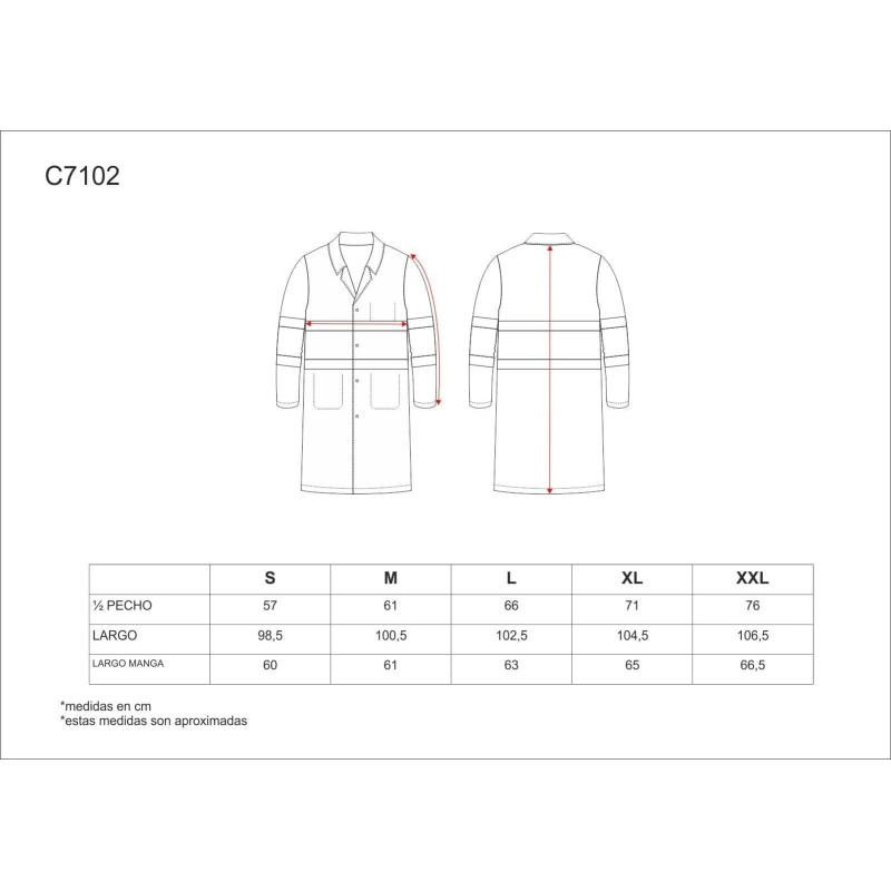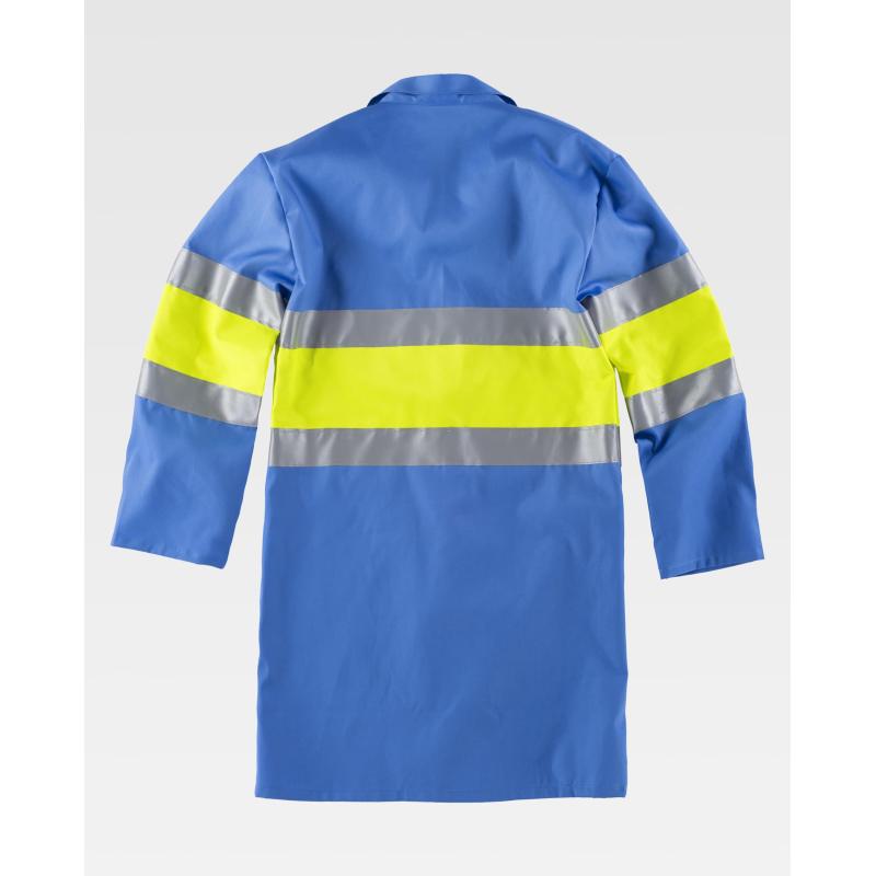 Bata combinada con alta visibilidad y cintas reflectantes. Cuello clásico con solapa. Cierre de corchetes. Un bolso de pecho y dos bolsos laterales de plastón en el interior. Dos cintas reflectantes en pecho, espalda y mangas con pieza central de alta visibilidad. Prin. 65% Poliéster 35% Algodón / A.V. 50% Poliéster 50% Algodón