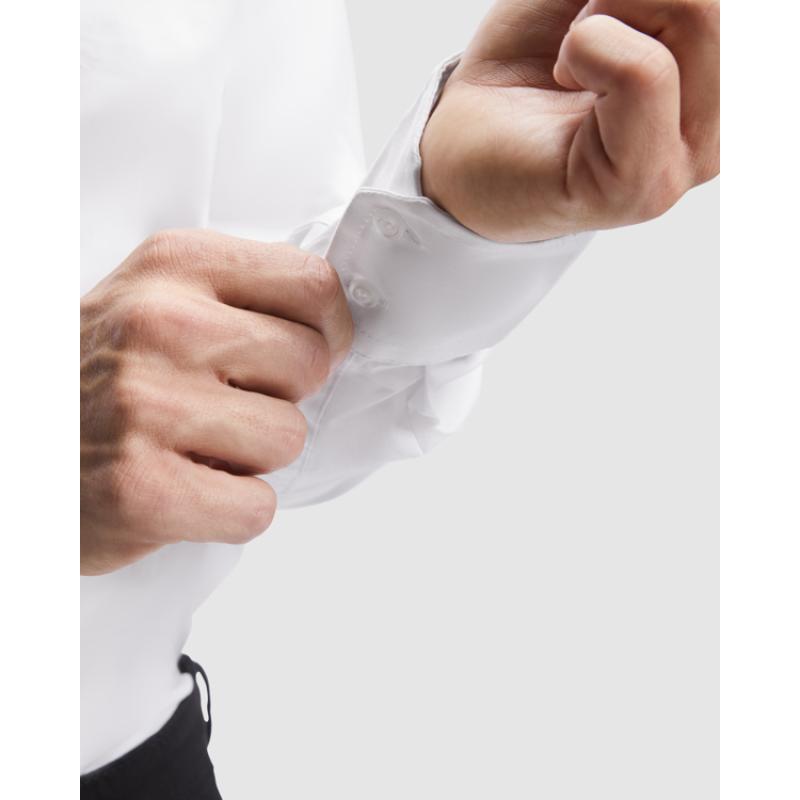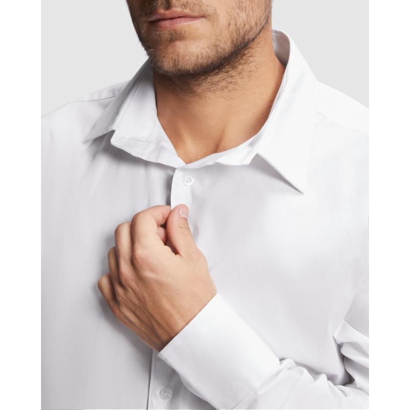 Camisa manga larga.· Tejido stretch.· Cuello clásico camisero.· Costura de hombro adelantada.· Canesú espalda.· Tapeta con botones al tono.· Puños con abotonadura doble y pinza al lado de la tapeta de puño con un botón más pequeño.· Bajo con forma redondeada.