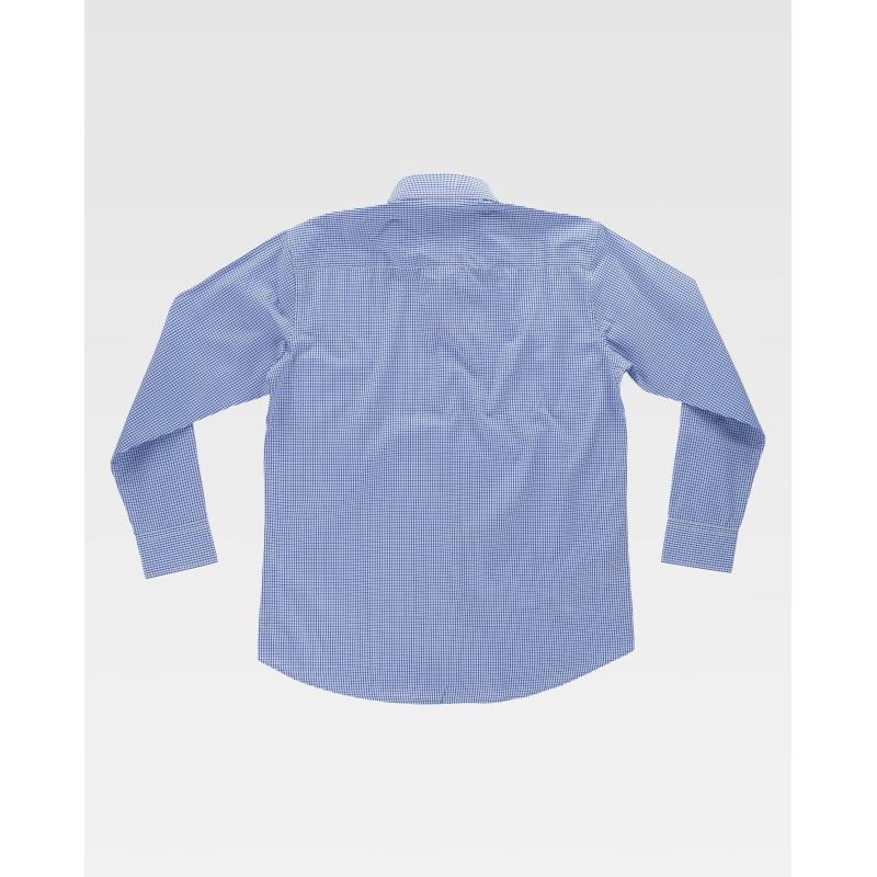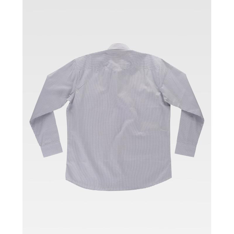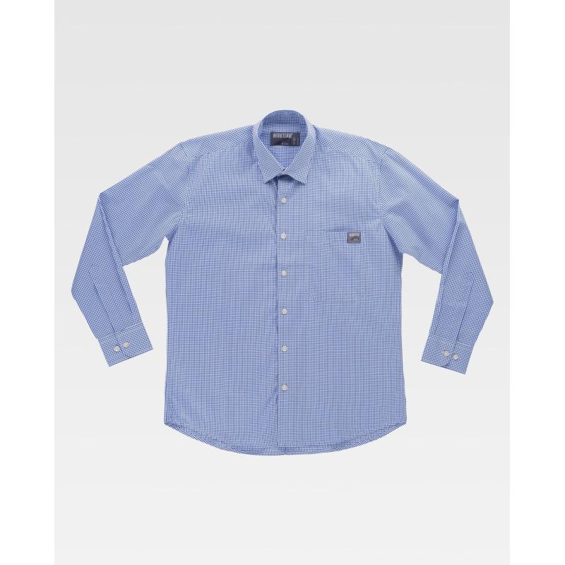 Camisa de cuadros con cuello clásico y cierre central de botones. Manga larga con puño de botón. Un bolso de pecho de plastón abierto. Espalda con canesú. Costuras reforzadas, bajo redondeado y botones. 90% Poliéster 10% Algodón