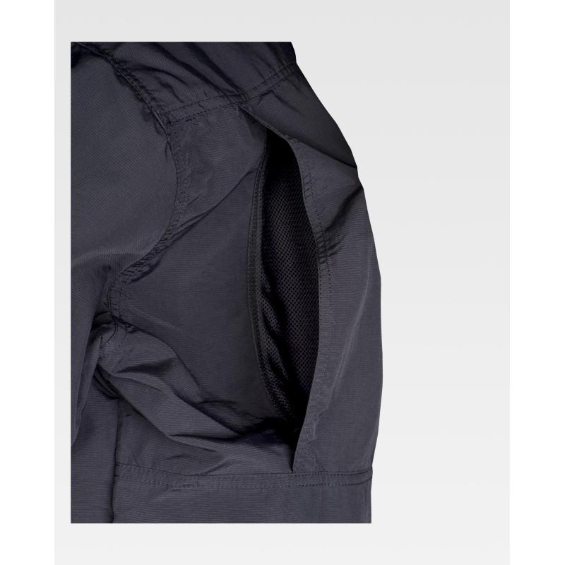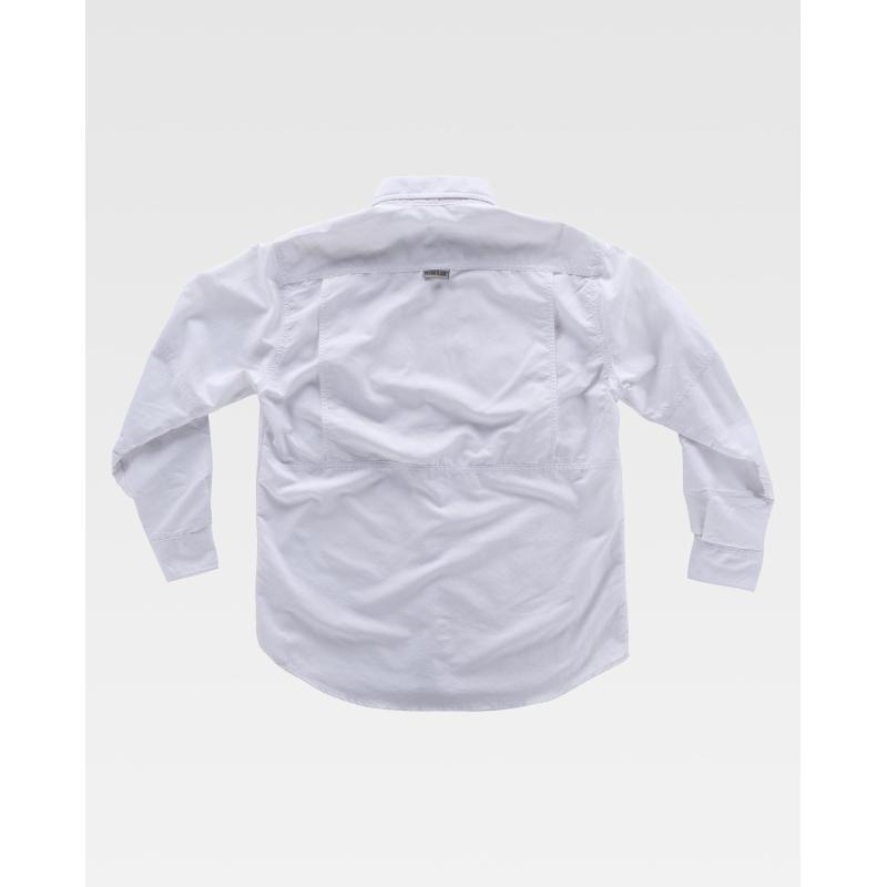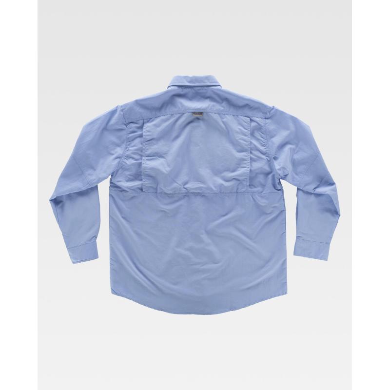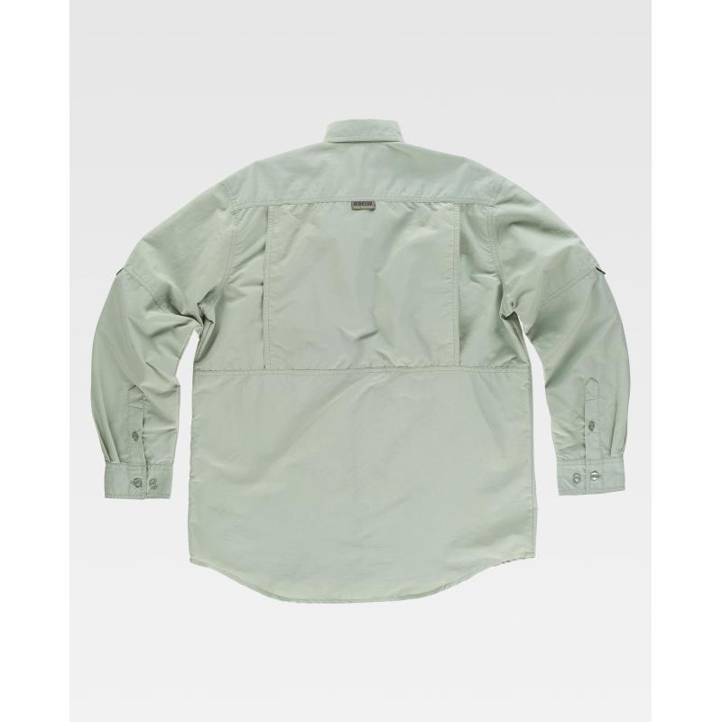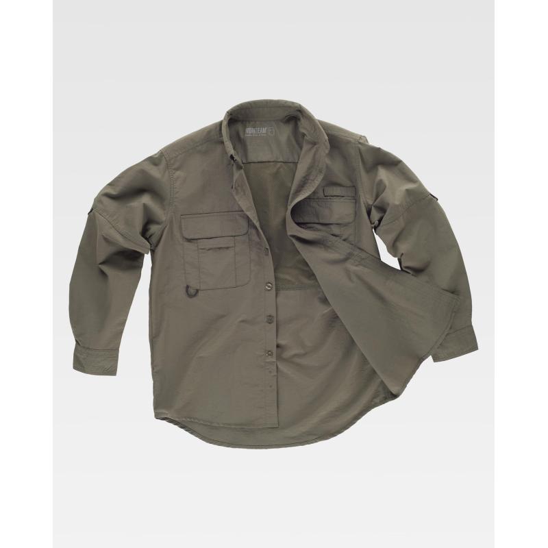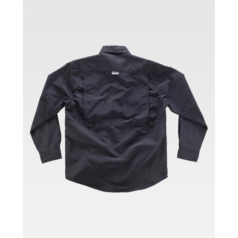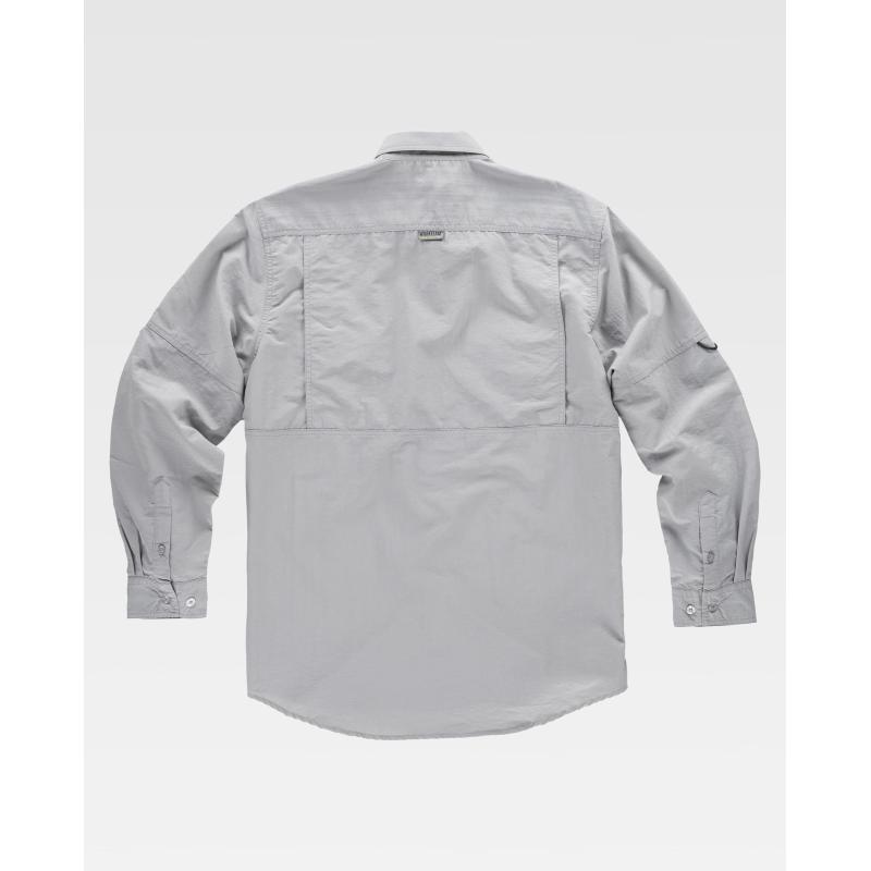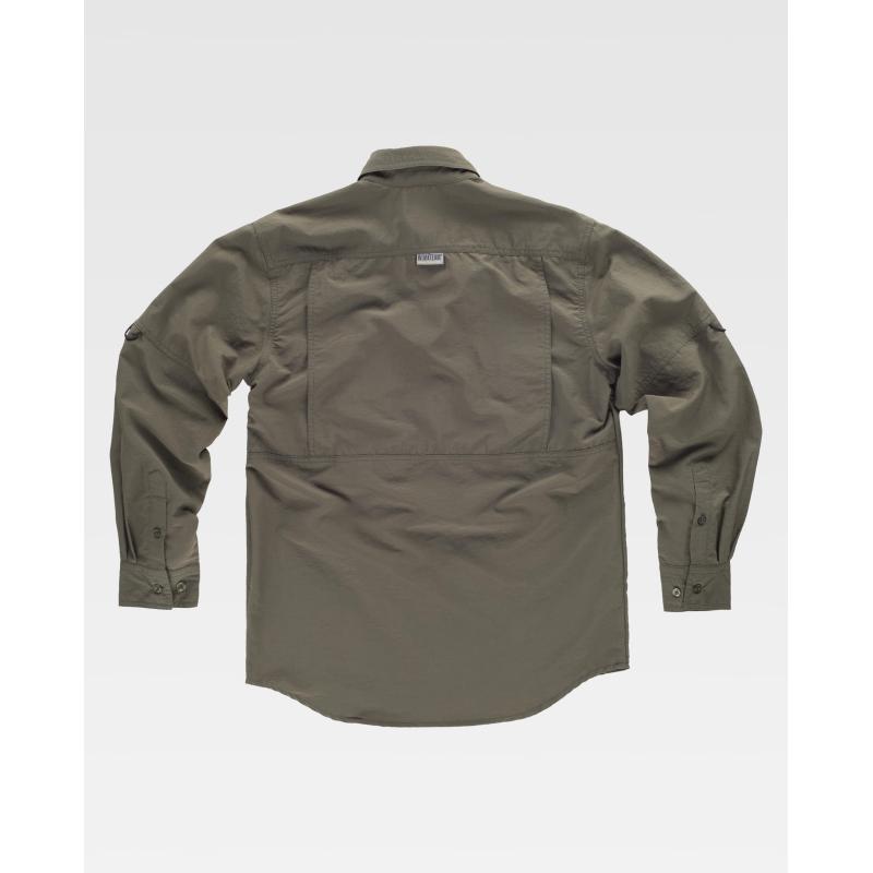Camisa safari con abertura trasera y rejilla interior para regular la transpiración. Cuello abotonado y cierre central de botones. Manga larga con trabilla de botón interior y cordón elástico para ajustar la longitud y puño de botón. Dos bolsos de pecho de plastón con cartera de velcro y bolsillos auxiliares superpuestos. Argolla de cordón elástico en bolso. Trabilla con velcro en el pecho. Espalda con canesú. Costuras reforzadas, bajo redondeado y botones al tono. Tejido resistente y de secado rápido. 100% Nylon