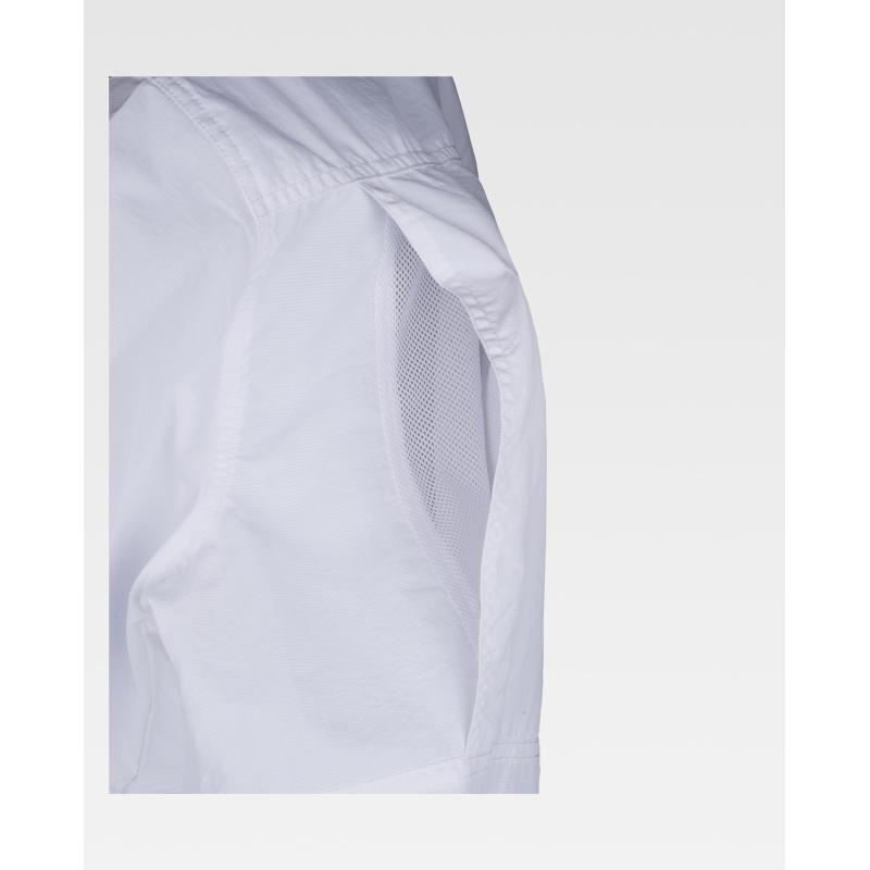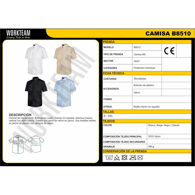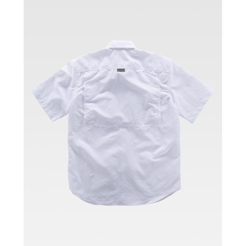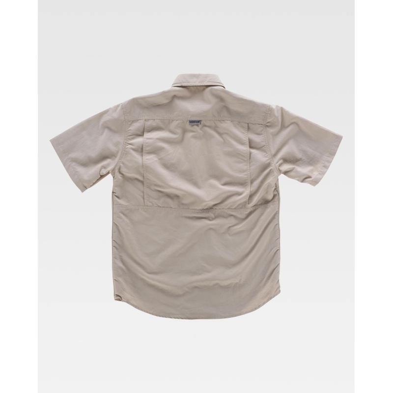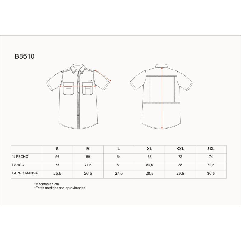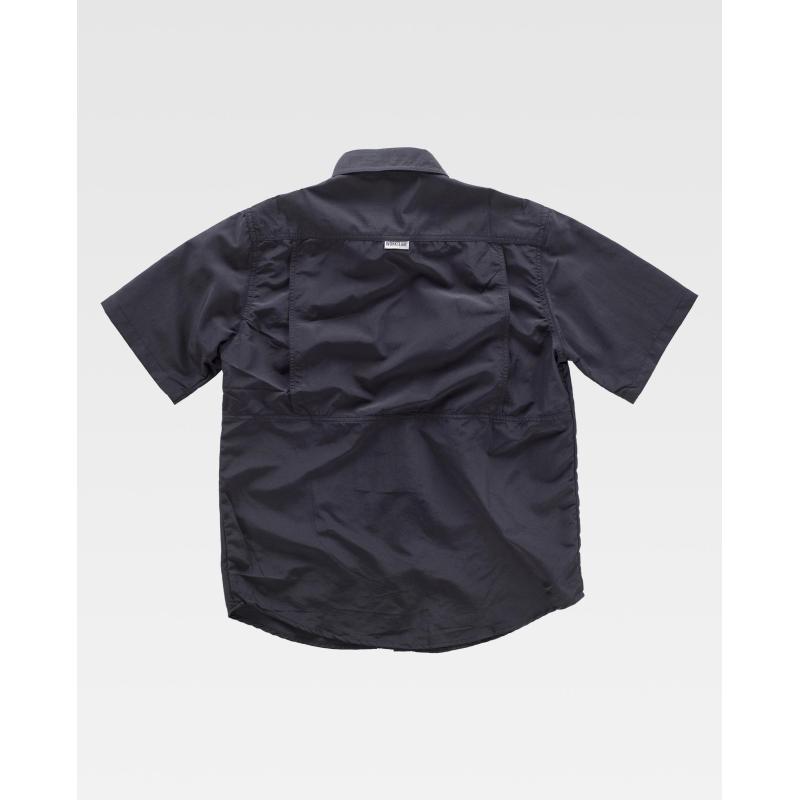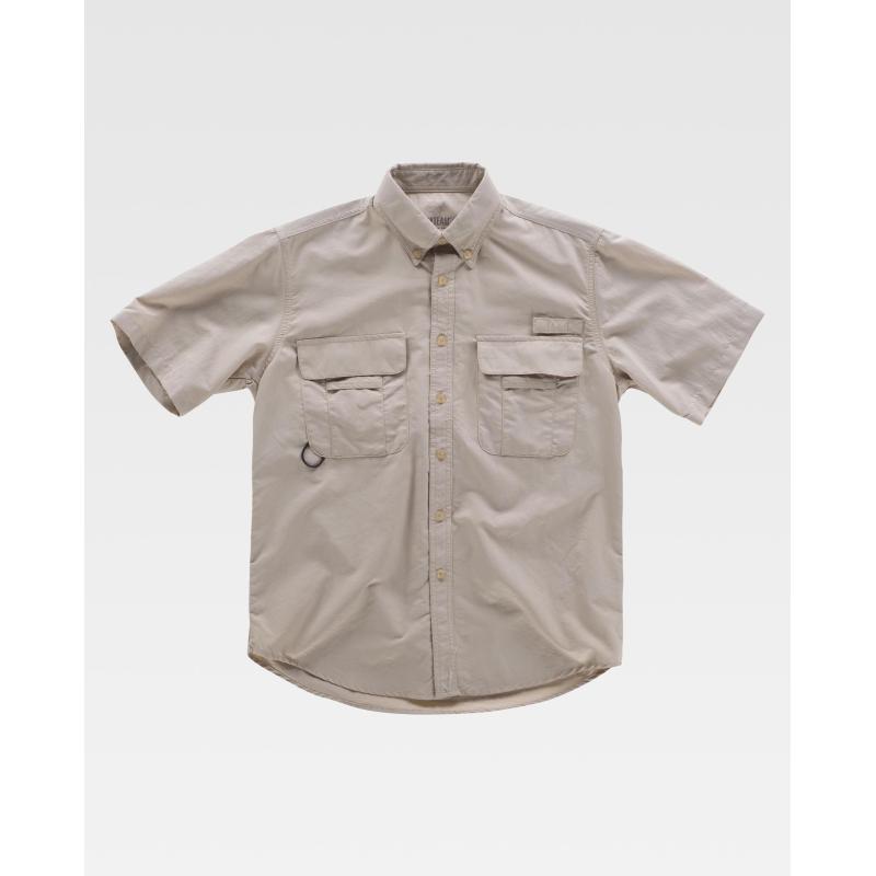 Camisa safari de manga corta con abertura trasera y rejilla interior para regular la transpiración. Cuello abotonado y cierre central de botones. Dos bolsos de pecho de plastón con cartera de velcro y bolsillos auxiliares superpuestos. Argolla de cordón elástico en bolso. Trabilla con velcro en el pecho. Espalda con canesú. Costuras reforzadas, bajo redondeado y botones al tono. Tejido resistente y de secado rápido. 100% Nylon