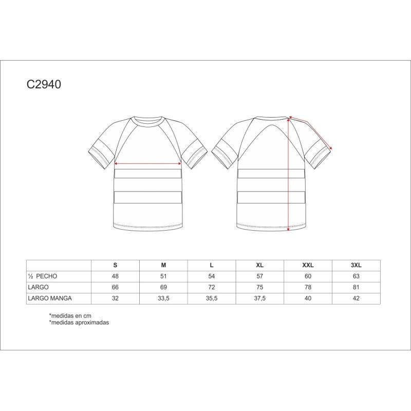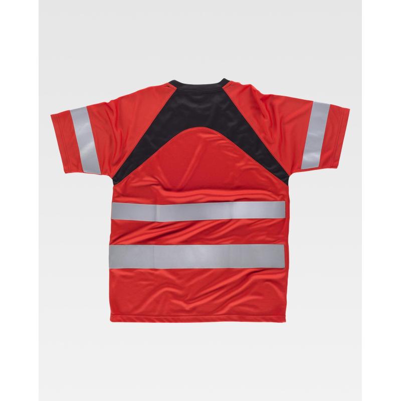 Camiseta combinada de manga ranglan corta en poliéster ojo de perdiz con cintas reflectantes. Cuello redondo con cubrecosturas interior y franjas a contraste en delantero y espalda. Una cinta reflectante en mangas y dos de distinto tamaño en pecho y espalda. Tejido fresco y ligero de alta permeabilidad al aire. Transpirable, de fácil secado y resistente al encogimiento. 100% Poliéster