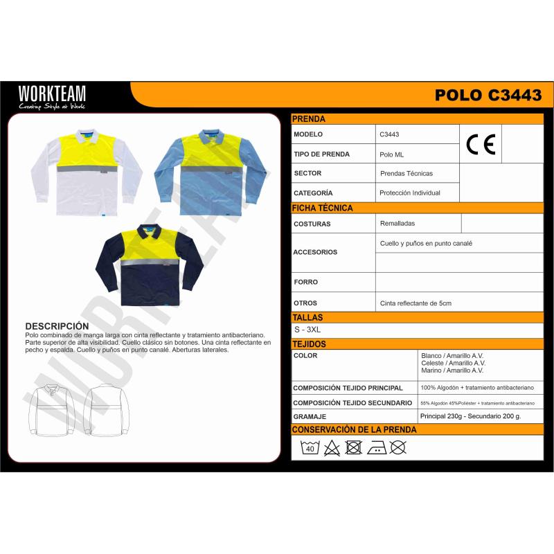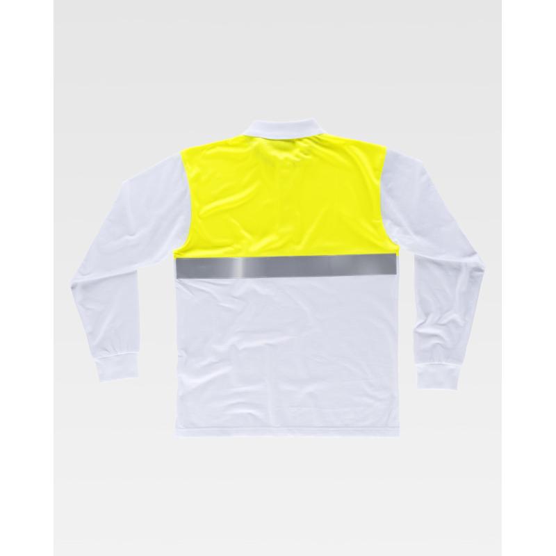 Polo combinado de manga larga con cinta reflectante en piqué de algodón con tratamiento antibacteriano. Parte superior de alta visibilidad. Cuello clásico sin botones. Cubrecosturas interior. Una cinta reflectante en pecho y espalda. Cuello y puños en punto canalé. Aberturas laterales. Tejido técnico transpirable con tratamiento con iones de plata para inhibir el crecimiento de bacterias y evitar la absorción de humedad y malos olores. 100% Algodón / 55% Algodón 45% Poliéster