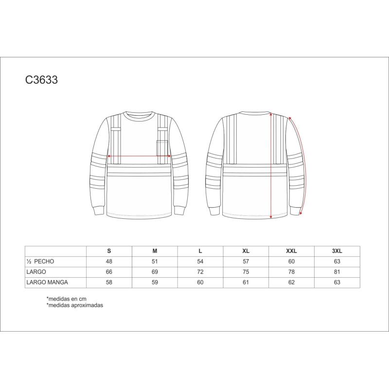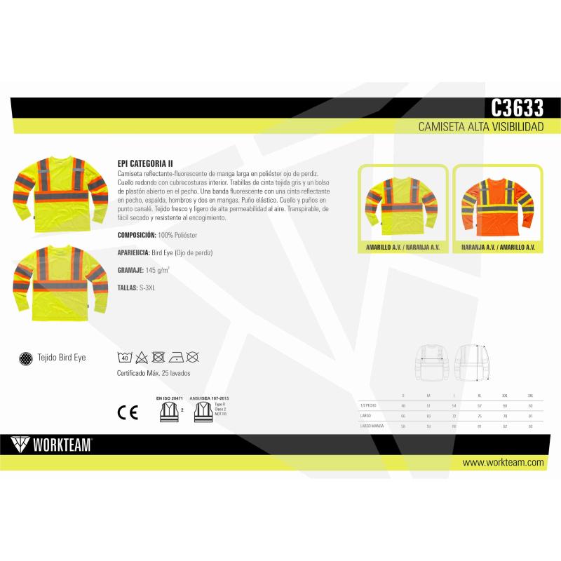 Camiseta reflectante-fluorescente de manga larga en poliéster ojo de perdiz. Cuello redondo con cubrecosturas interior. Trabillas de cinta tejida gris y un bolso de plastón abierto en el pecho. Una banda fluorescente con una cinta reflectante en pecho, espalda, hombros y dos en mangas. Puño elástico. Cuello y puños en punto canalé. Tejido fresco y ligero de alta permeabilidad al aire. Transpirable, de fácil secado y resistente al encogimiento. 100% Poliéster