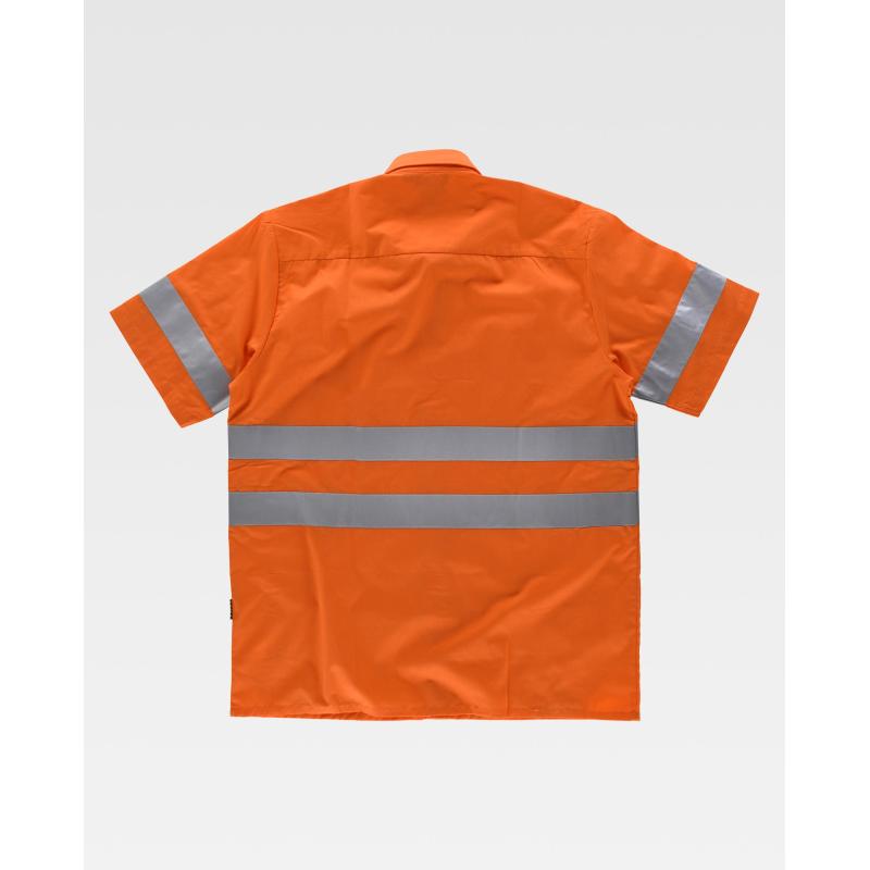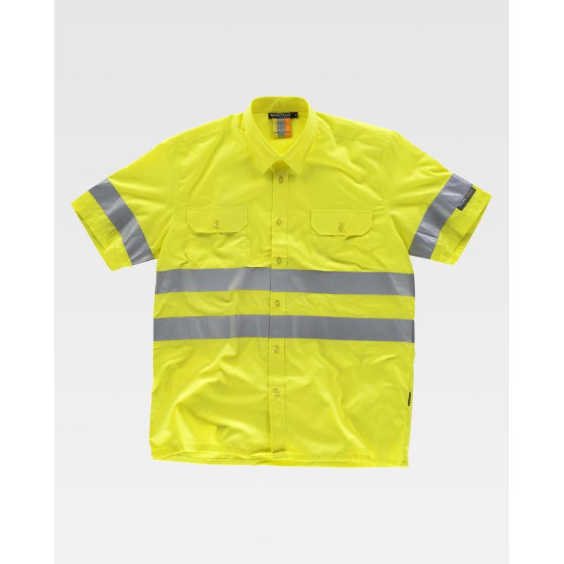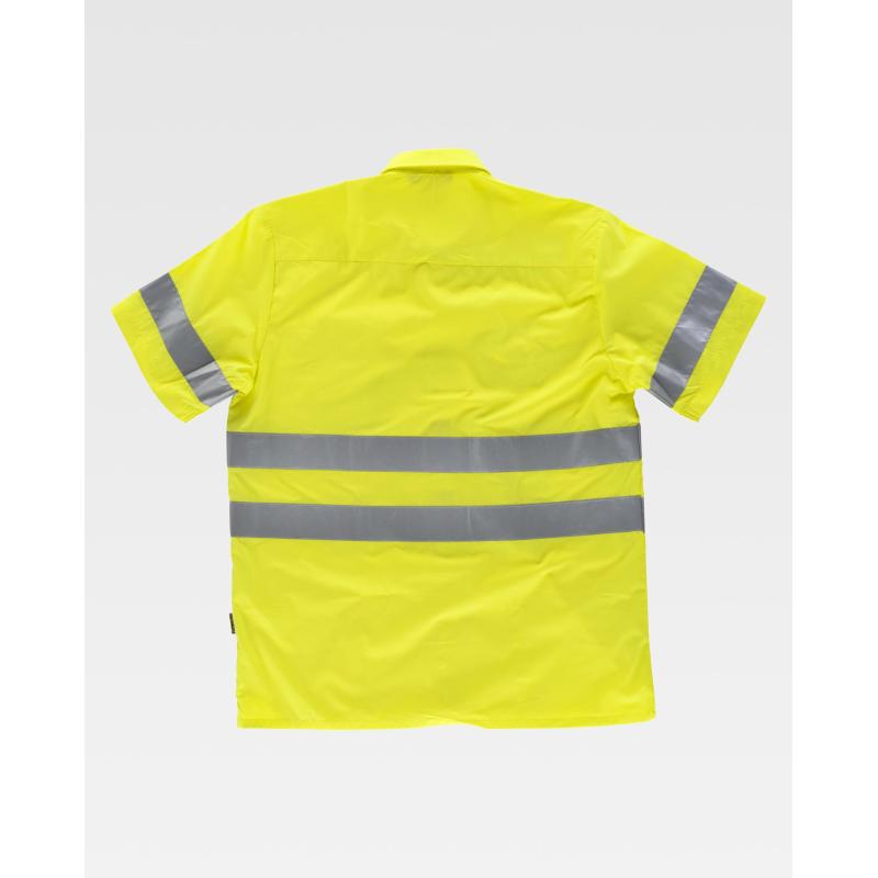 Camisa de alta visibilidad de manga corta con cintas reflectantes. Cuello clásico y cierre central de botones. Dos bolsos en pecho de plastón con cartera de botón. Una cinta reflectante en mangas y dos en pecho y espalda. Espalda con canesú. Botones al tono. 65% Poliéster 35% Algodón