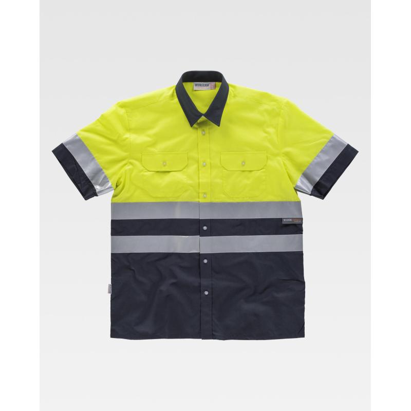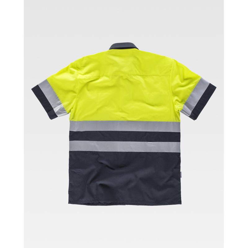 Camisa combinada de manga corta con cintas reflectantes. Parte superior de alta visibilidad. Cuello clásico y cierre central de botones. Dos bolsos de pecho de plastón con cartera de botón. Una cinta reflectante en mangas y dos en pecho y espalda. Espalda con canesú. 65% Poliéster 35% Algodón