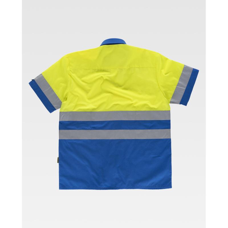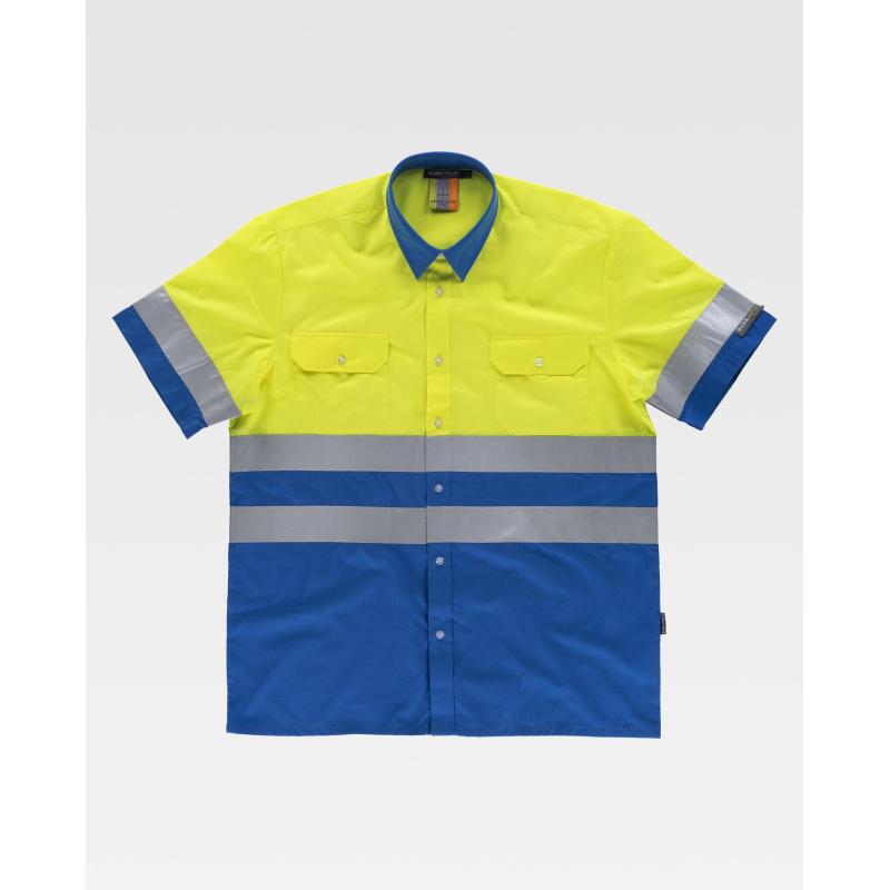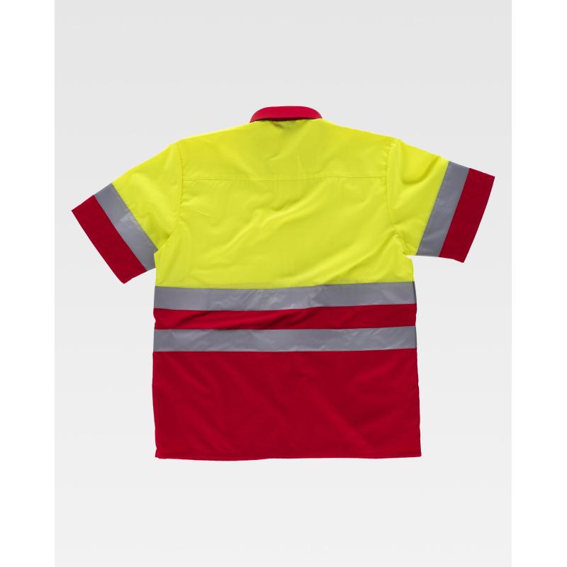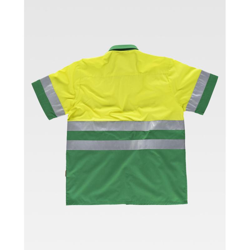 Camisa combinada de manga corta con cintas reflectantes. Parte superior de alta visibilidad. Cuello clásico y cierre central de botones. Dos bolsos de pecho de plastón con cartera de botón. Una cinta reflectante en mangas y dos en pecho y espalda. Espalda con canesú. 65% Poliéster 35% Algodón