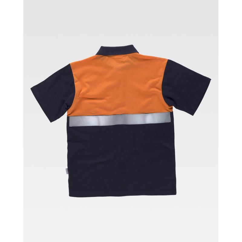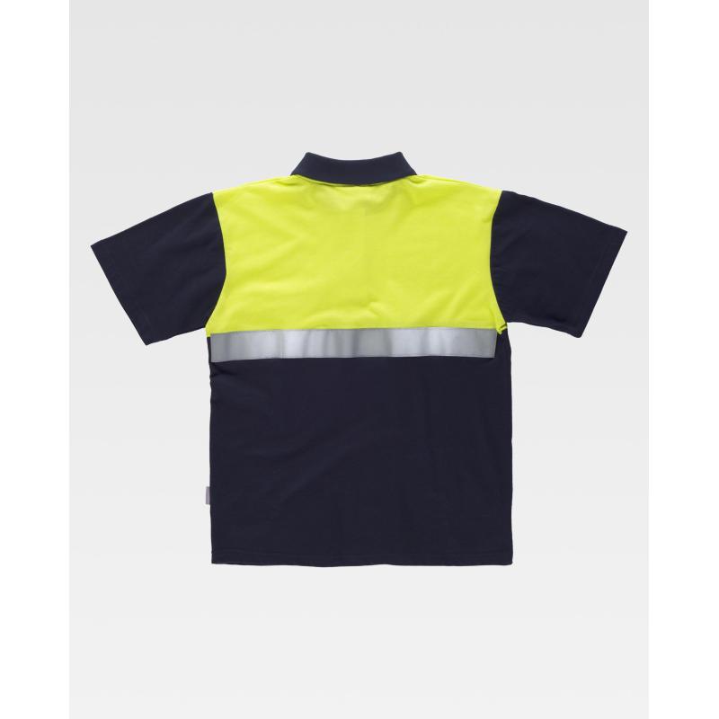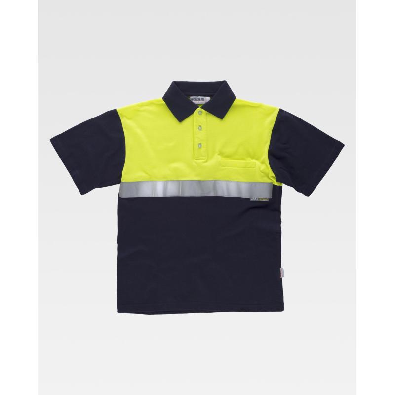 Polo combinado de manga corta en piqué de algodón con cinta reflectante. Parte superior de alta visibilidad. Cuello clásico con tapeta de tres botones y cubrecosturas interior. Un bolso de pecho de ojal. Una cinta reflectante en pecho y espalda. Tejido fresco y poroso que permite una adecuada ventilación. Cuello en punto canalé. Aberturas laterales. Tejido principal: 100% Algodón. Tejido secundario A.V: 65% Poliéster 35% Algodón