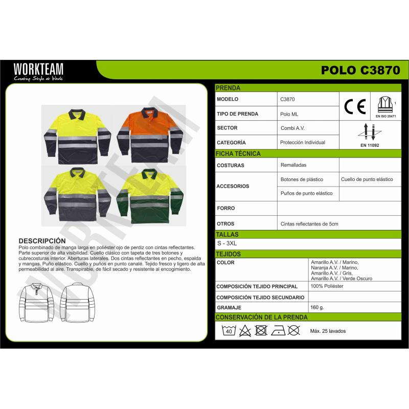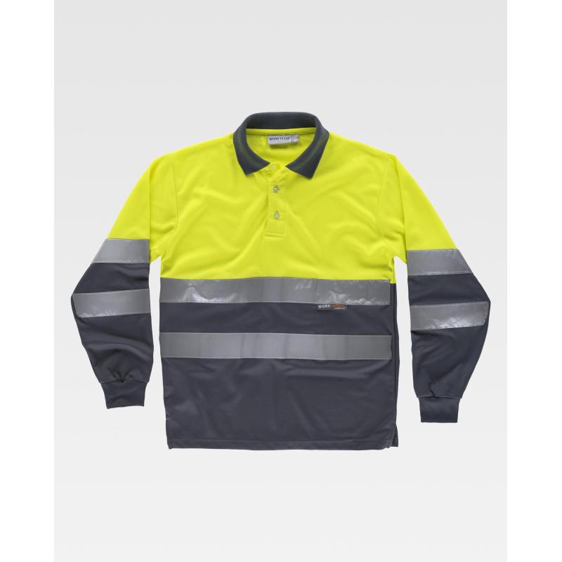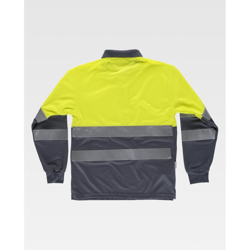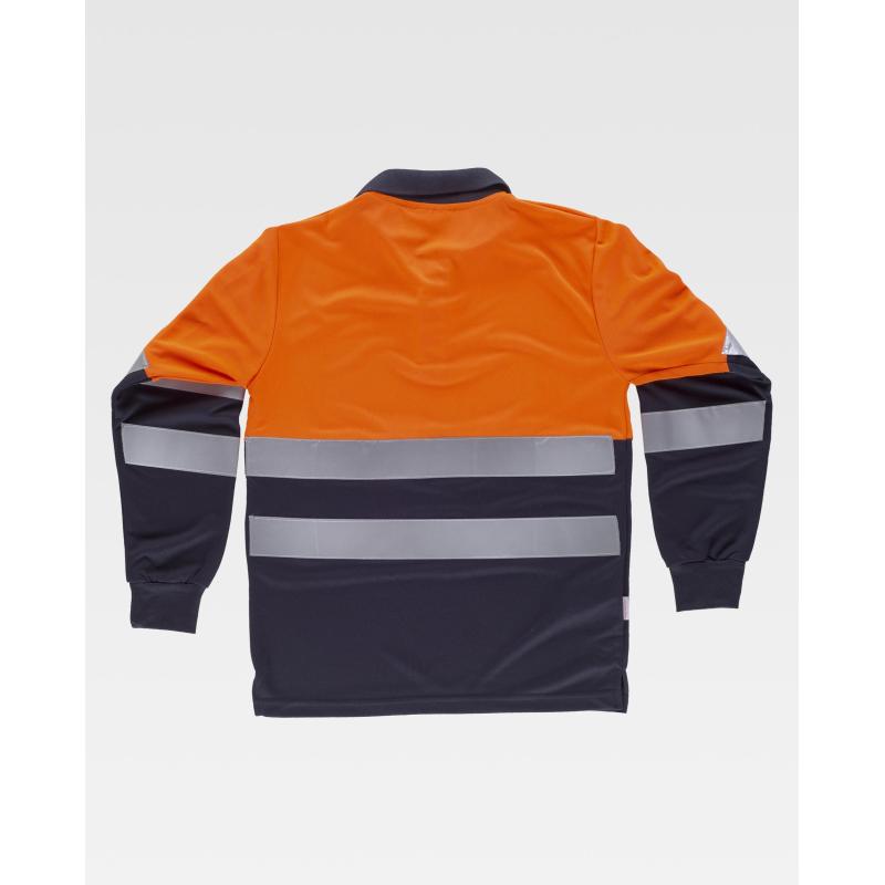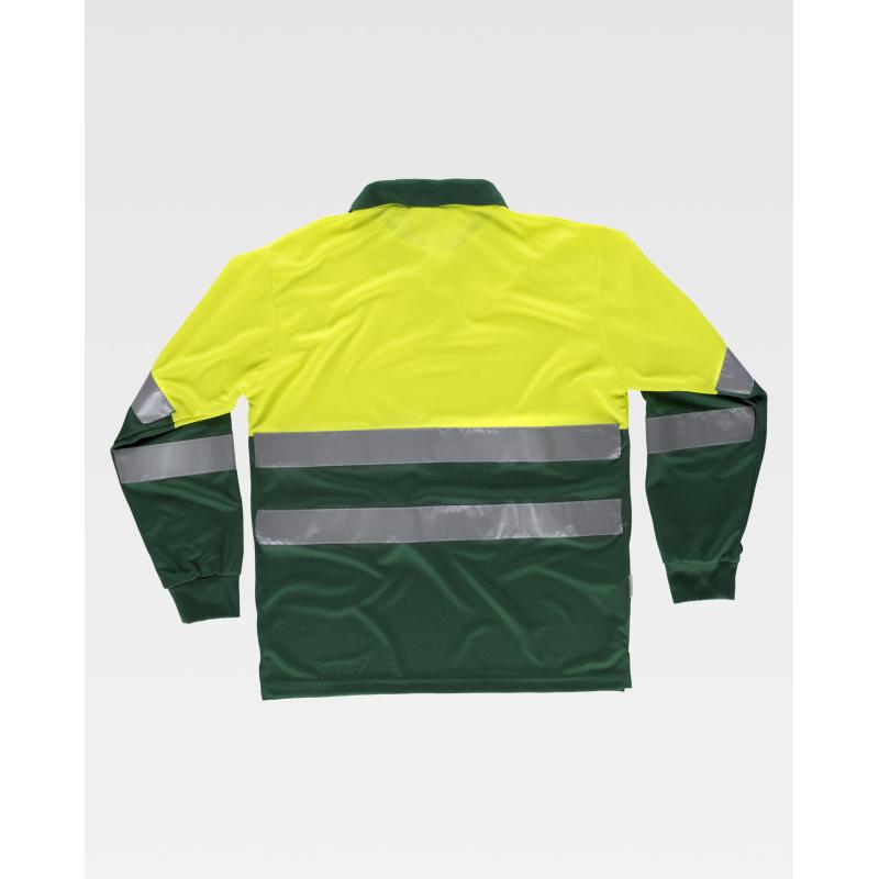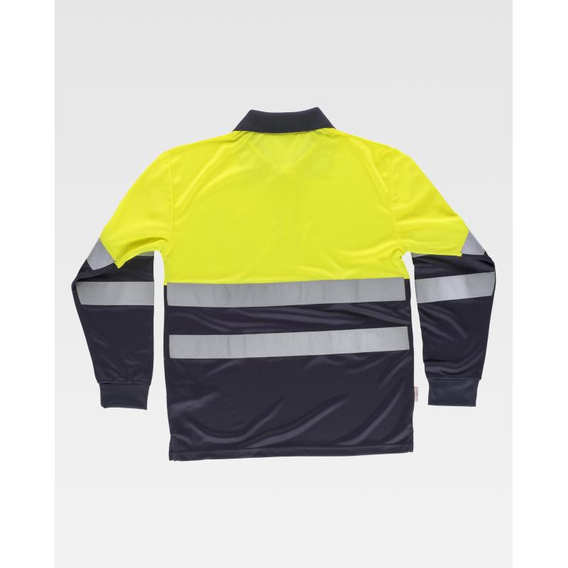 Polo combinado de manga larga en poliéster ojo de perdiz con cintas reflectantes. Parte superior de alta visibilidad. Cuello clásico con tapeta de tres botones y cubrecosturas interior. Aberturas laterales. Dos cintas reflectantes en pecho, espalda y mangas. Puño elástico. Cuello y puños en punto canalé. Tejido fresco y ligero de alta permeabilidad al aire. Transpirable, de fácil secado y resistente al encogimiento. 100% Poliéster