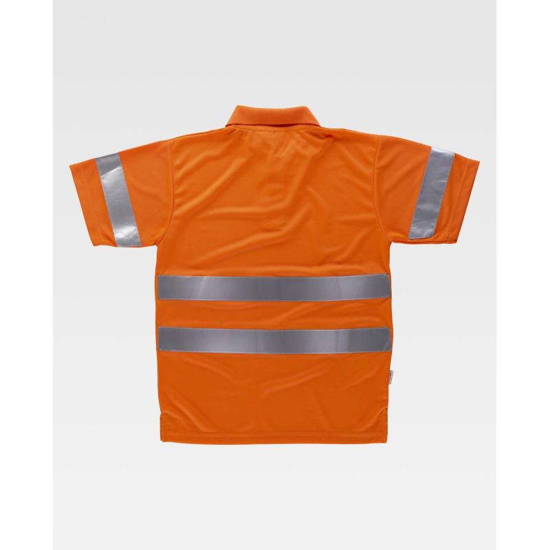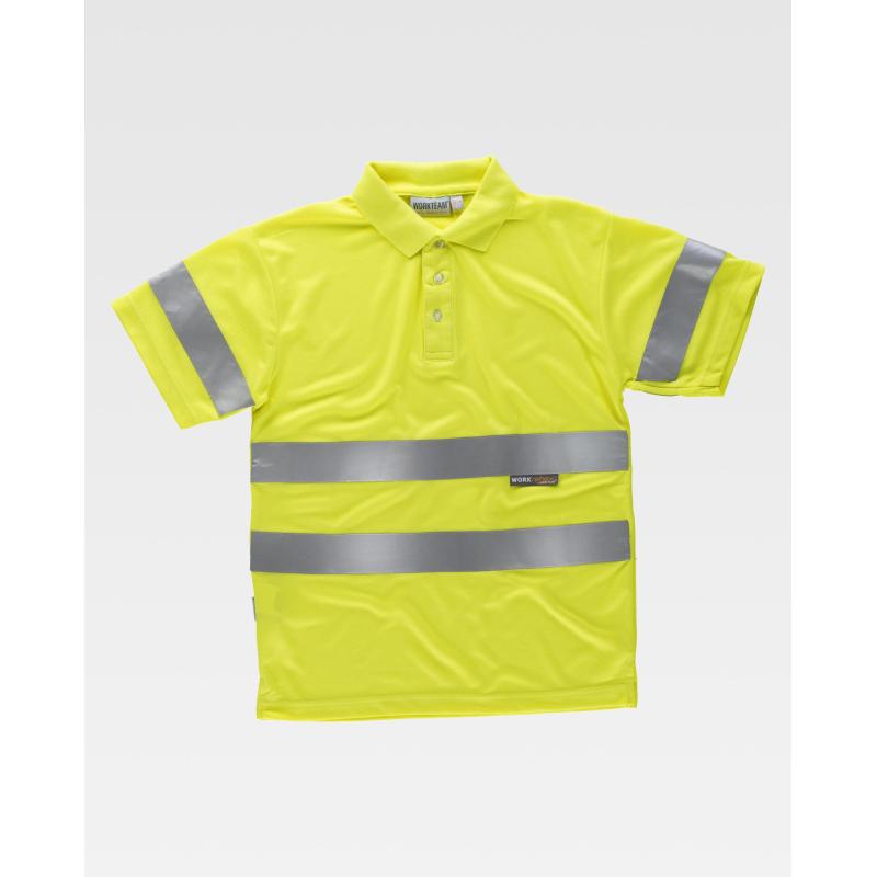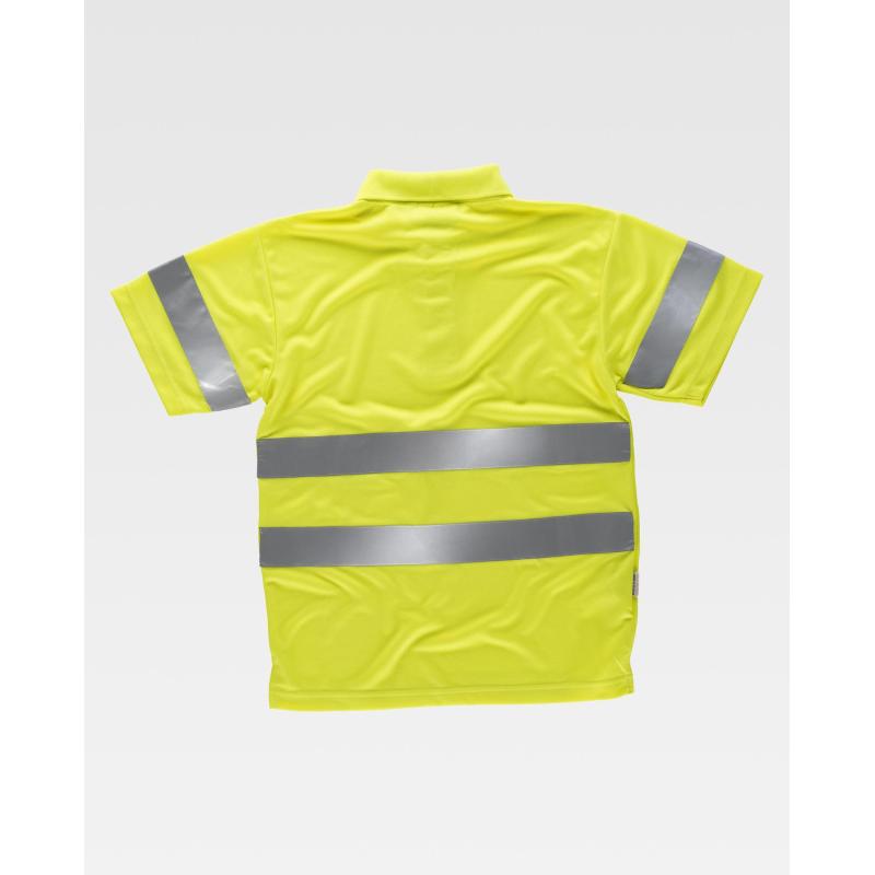Polo de alta visibilidad de manga corta en poliéster ojo de perdiz con cintas reflectantes. Cuello clásico con tapeta de tres botones y cubrecosturas interior. Una cinta reflectante en mangas y dos en pecho y espalda. Tejido fresco y ligero de alta permeabilidad al aire. Transpirable, de fácil secado y resistente al encogimiento. Cuello en punto canalé. 100% Poliéster