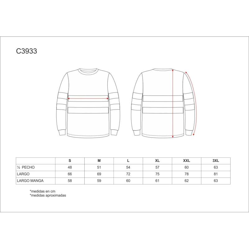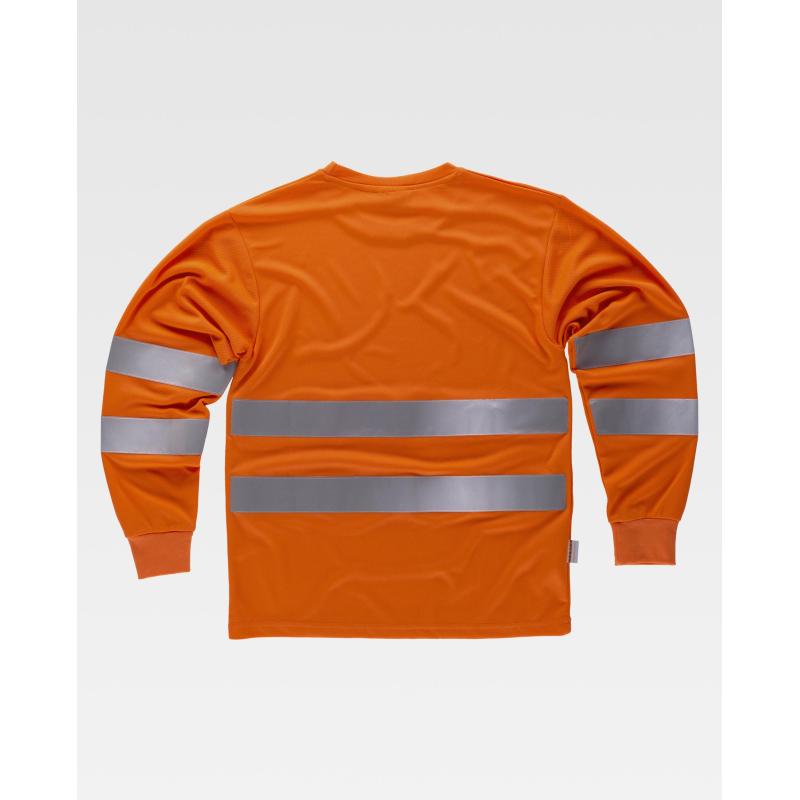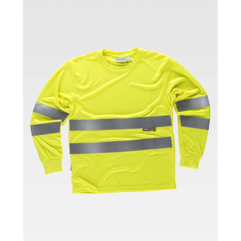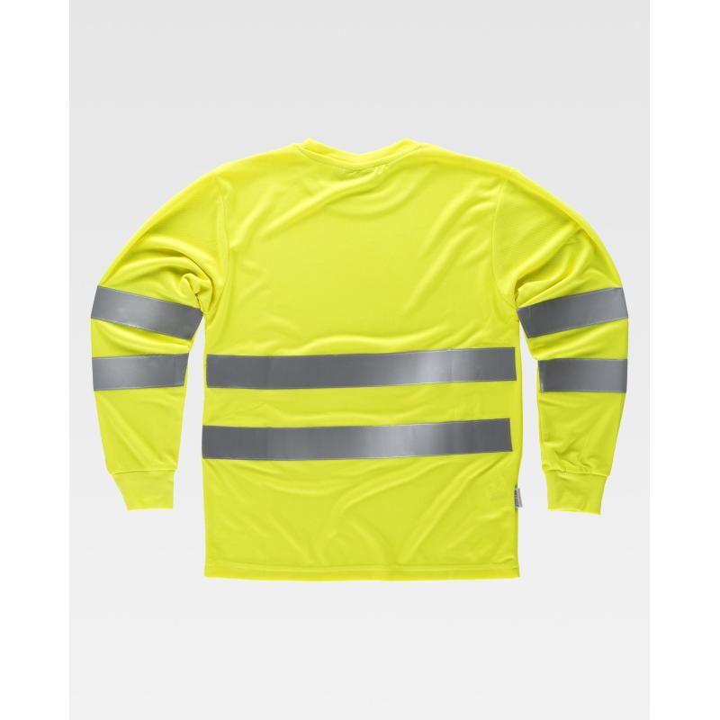 Camiseta de alta visibilidad de manga larga en poliéster ojo de perdiz con cintas reflectantes. Cuello redondo con cubrecosturas interior. Dos cintas reflectantes en pecho, espalda y mangas. Puño elástico. Tejido fresco y ligero de alta permeabilidad al aire. Transpirable, de fácil secado y resistente al encogimiento. 100% Poliéster