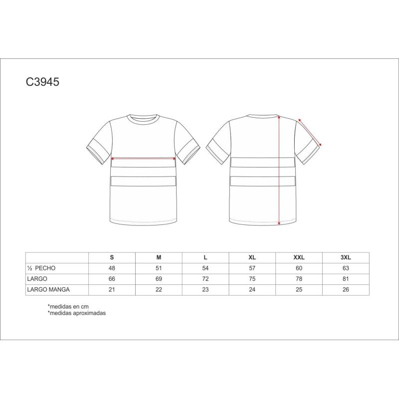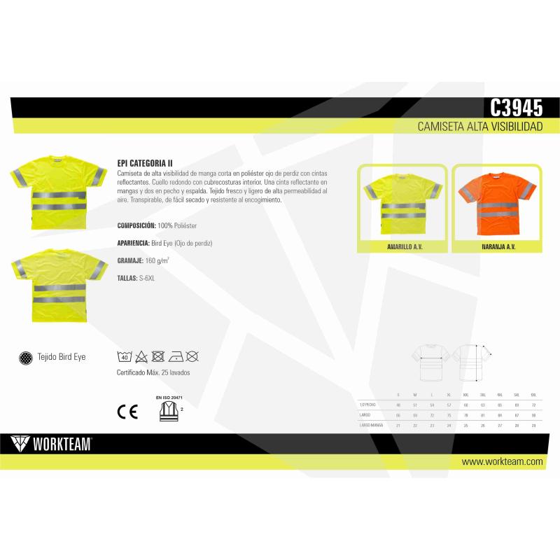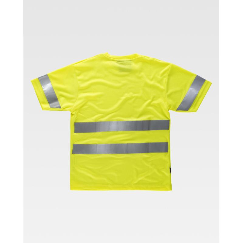 Camiseta de alta visibilidad de manga corta en poliéster ojo de perdiz con cintas reflectantes. Cuello redondo con cubrecosturas interior. Una cinta reflectante en mangas y dos en pecho y espalda. Tejido fresco y ligero de alta permeabilidad al aire. Transpirable, de fácil secado y resistente al encogimiento. 100% Poliéster