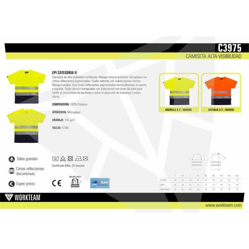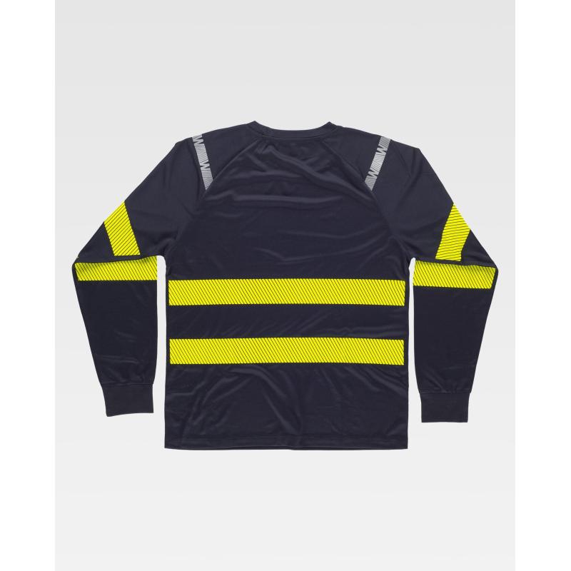Camiseta de manga larga en micropiqué de poliéster combinada con cintas reflectantes de alta visibilidad. Cuello redondo con cubrecosturas interior. Mangas ranglan. Dos cintas termoselladas reflectantes fluorescentes en mangas, pecho y espalda. Cinta reflectante decorativa personalizada en hombros. Puño elástico. 100% Poliéster