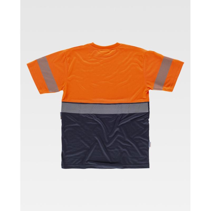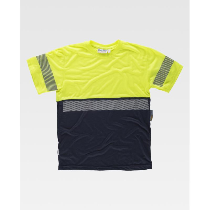 Camiseta combinada de manga corta en poliéster. Reflectantes y parte superior de alta visibilidad. Cuello redondo en punto canalé con cubrecosturas interior. Reflectante segmentada termoadhesiva en pecho, espalda y mangas. Tacto suave. 100% Poliéster