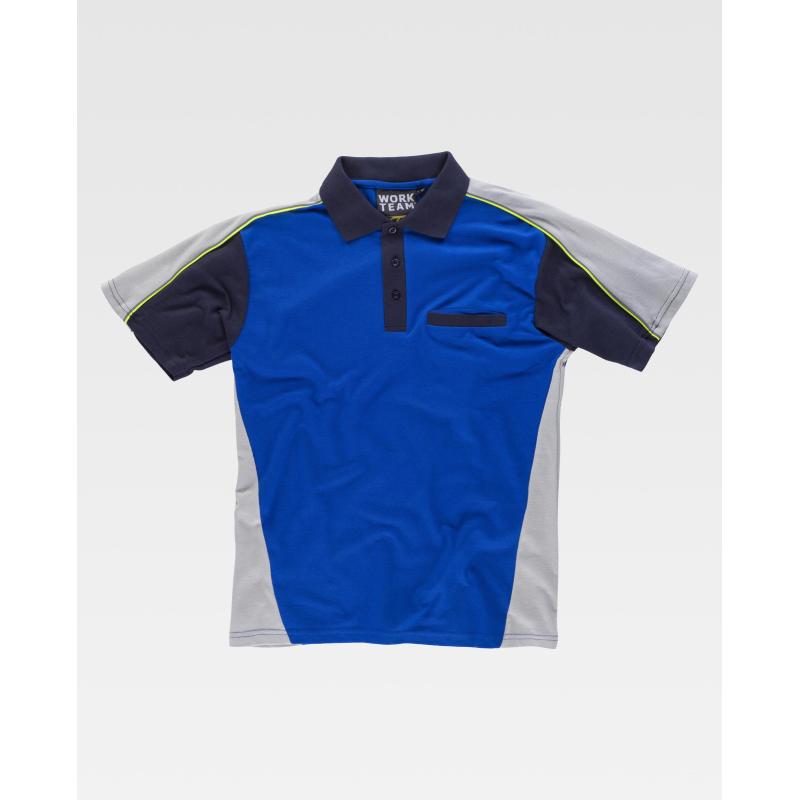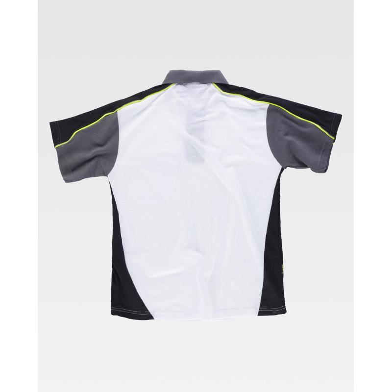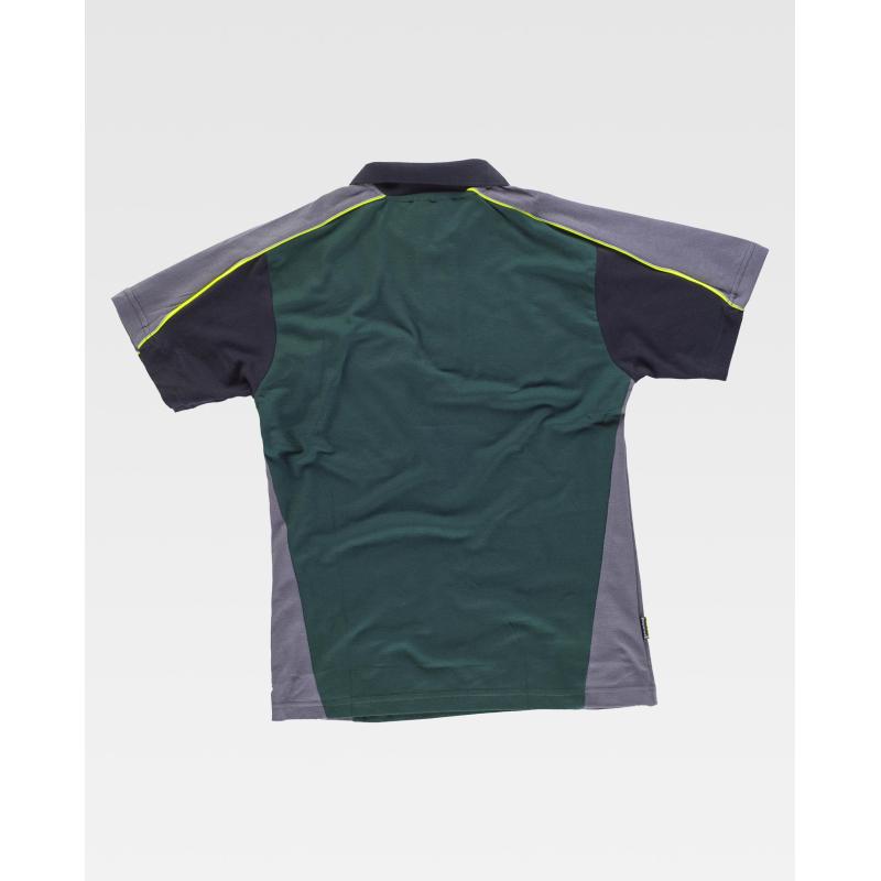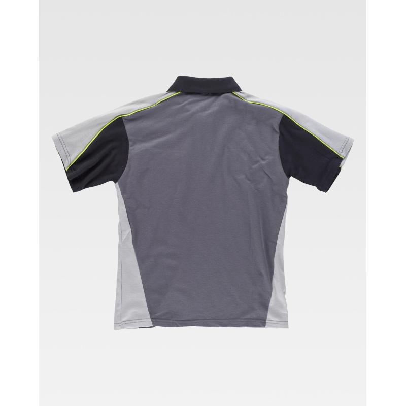 Polo tricolor de manga corta en tejido piqué con vivos de alta visibilidad. Cuello clásico con tapeta de tres botones y cubrecosturas interior. Pieza combinada en hombros con doble vivo que continúa en la manga. Un bolso de pecho de ojal. Tejido fresco y poroso que permite una adecuada ventilación. Cuello en punto canalé. 65% Poliéster 35% Algodón