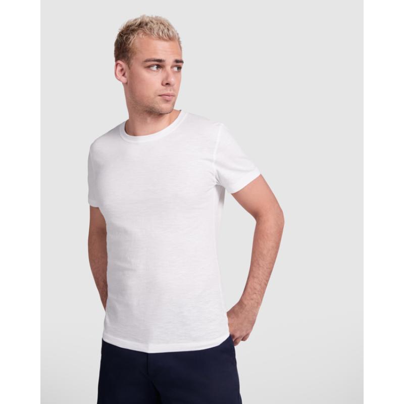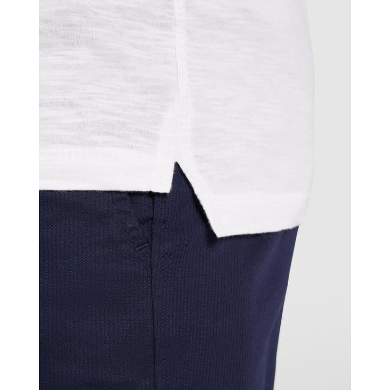 Camiseta de manga corta, en tejido vigoré inclinado. Cuello redondo del mismo tejido. Cubrecosturas interior a contraste de hombro a hombro. Costuras laterales remalladas de adorno. Bajo con aperturas laterales y el patronaje de la espalda es ligeramente más largo que el delantero.