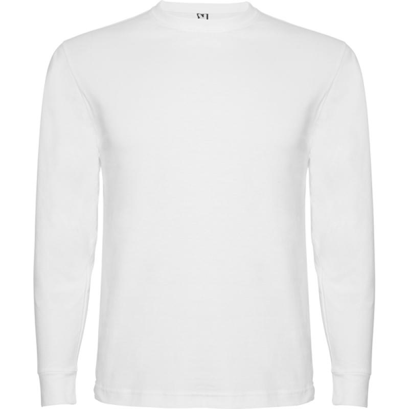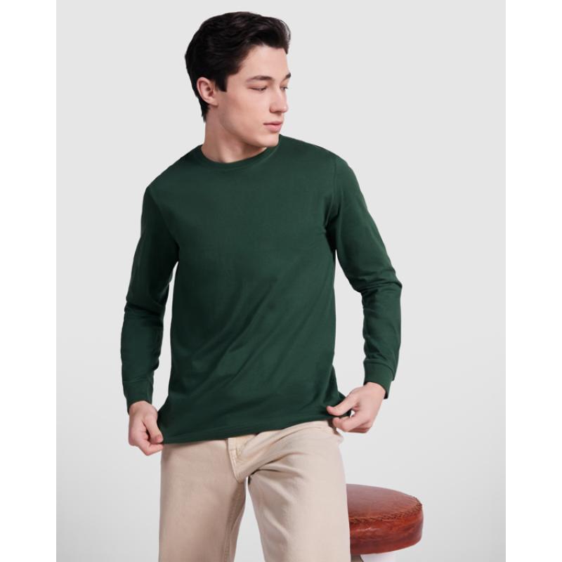 Camiseta de manga larga tubular en tallas de adulto y costuras laterales en tallas de niño. Cuello redondo y puños en canalé 1x1 (cuello 4 capas). Cubrecosturas en cuello del mismo tejido.